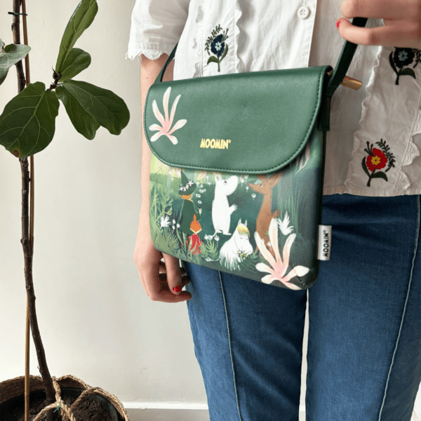 Fin axelremsväska med vännerna Mumintrollet, Snorkfröken, Lilla My, Sniff och Snusmumriken på äventyr i skogen. Väska i härligt grön färg, som stängs med tryckknapp och dragkedja. Väskan mäter. 21,5 x 23 x 3,5 cm.