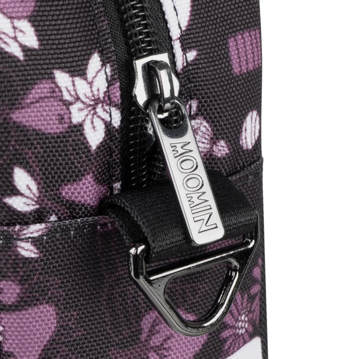 En praktisk Mumin axelremsväska i fint mönster, tillverkad i stadig polyestercanvas. Väskan har blixtlås upptill och en blixtlåsförsedd innerficka. Den justerbara axelremmen (135 cm) är löstagbar och helmönstrad med Moomin-loggan ton-i-ton. Detaljrik väska i svart/plommon, med fint mönster där vännerna i mumindalen firar höstens skörd.