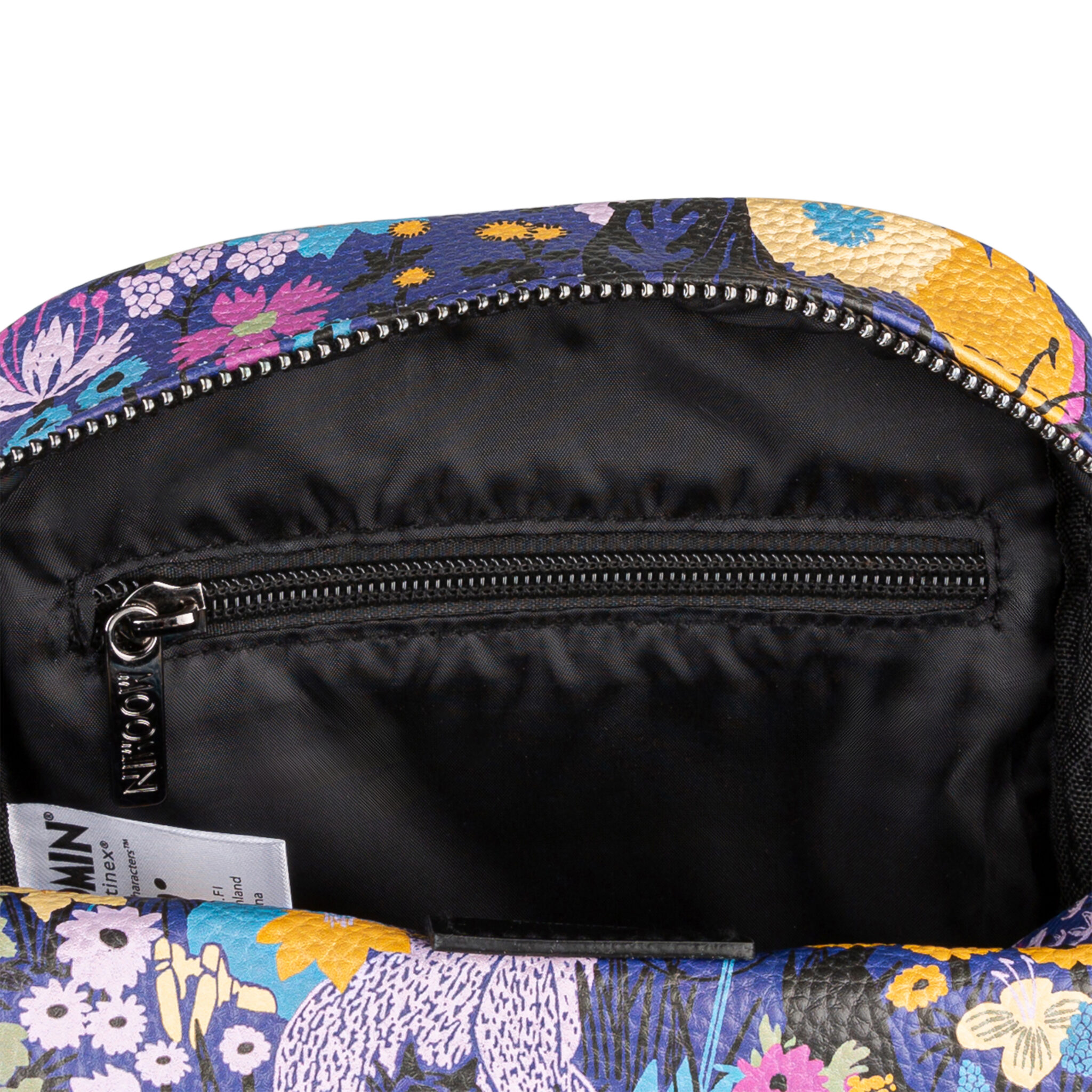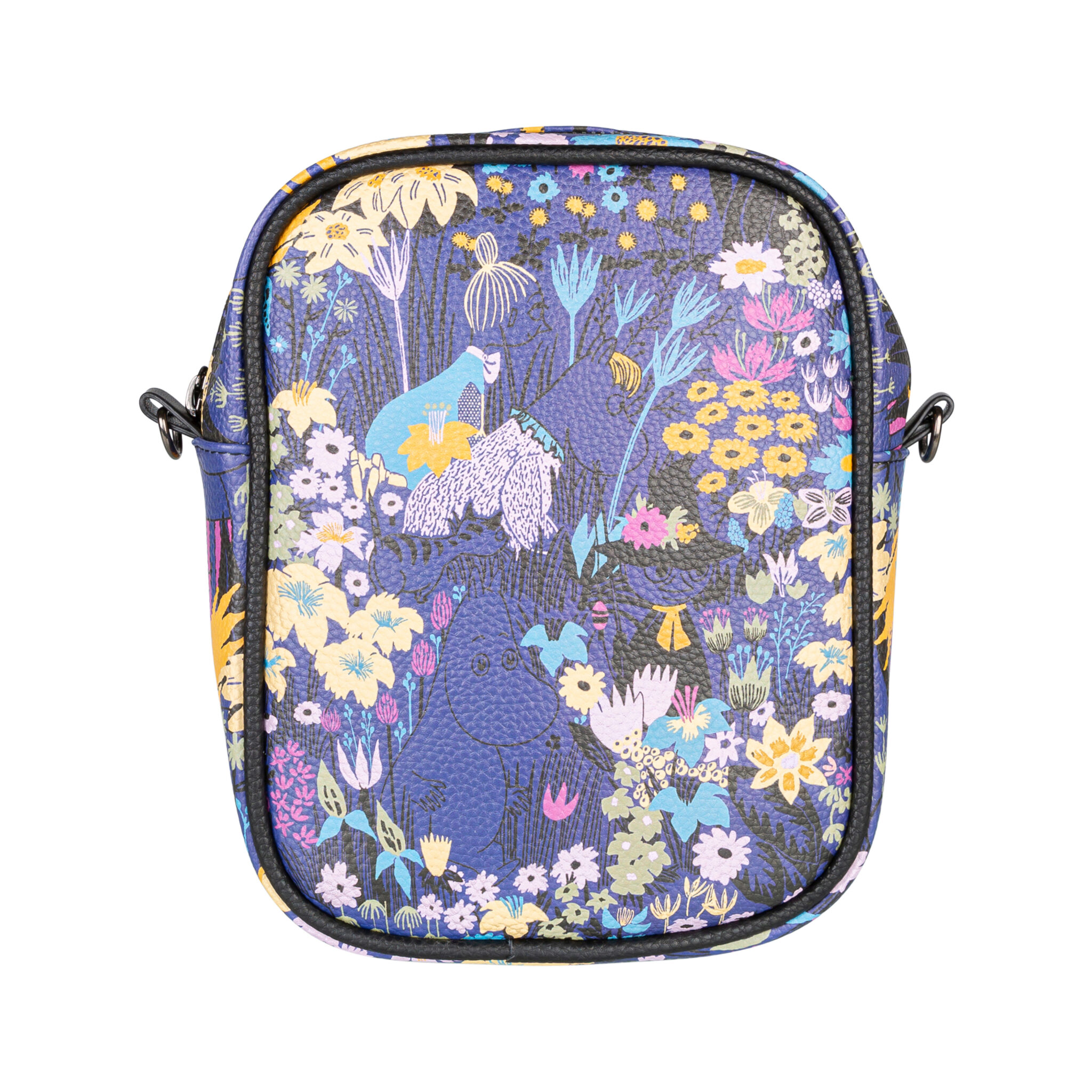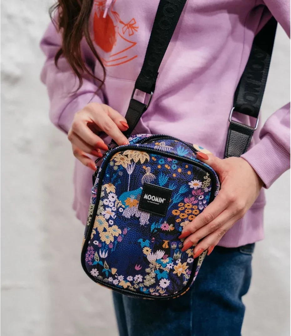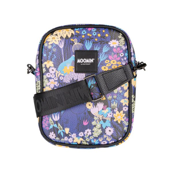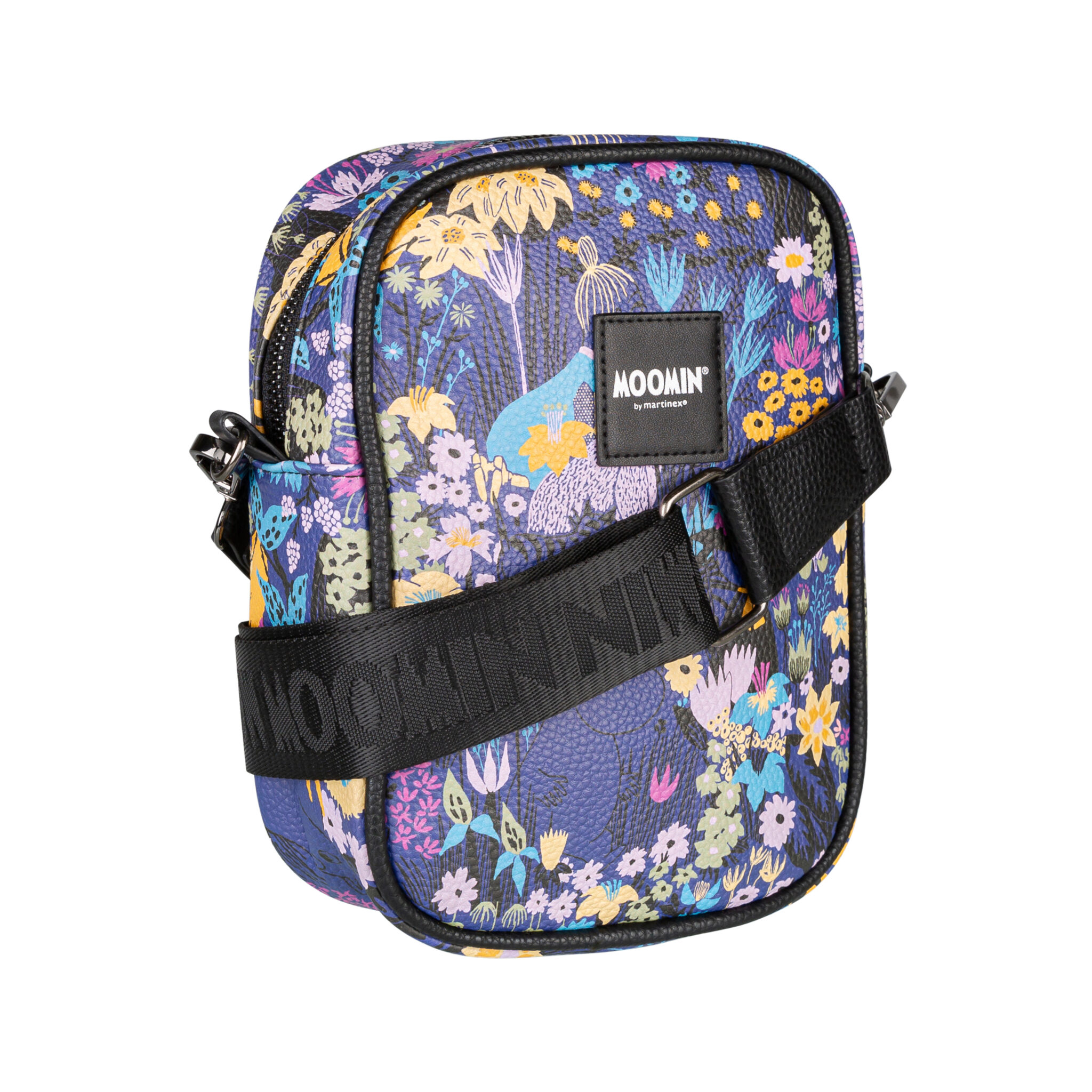 Mumin Axelremsväska i praktisk storlek, tillverkad i tålig läderimitation med blixtlås upptill och blixtlåsförsedd innerficka. Axelväskan är blå/lila/svart med inslag av gult, rosa mm med motiv med Mumintrollet, Snusmumriken och Mymlan i ett hav av blommor. 15,5 x 20 x 7cm.