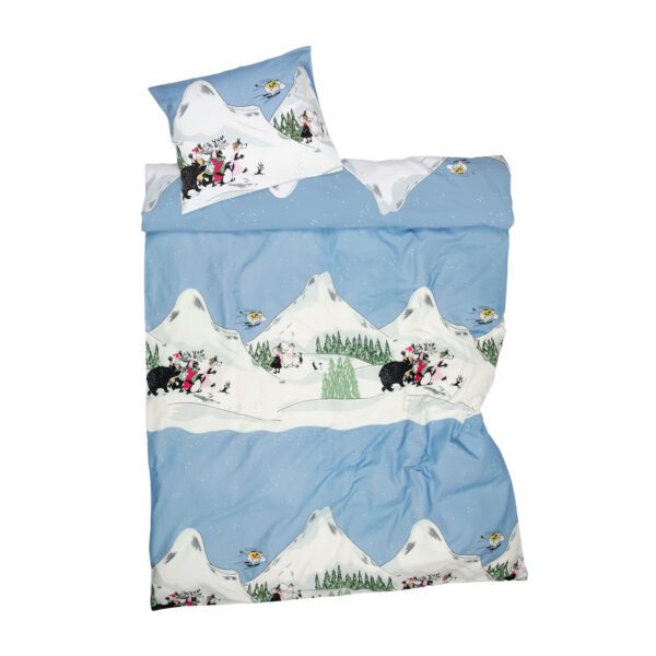 Sov gott i vårt ljuvliga mumin bäddset i den fina illustrationen Backhoppning setet innehåller påslakan och örngott. Mått påslakan150 x 210 cm, örngott 50 x 60 cm. GOTS certifierat.