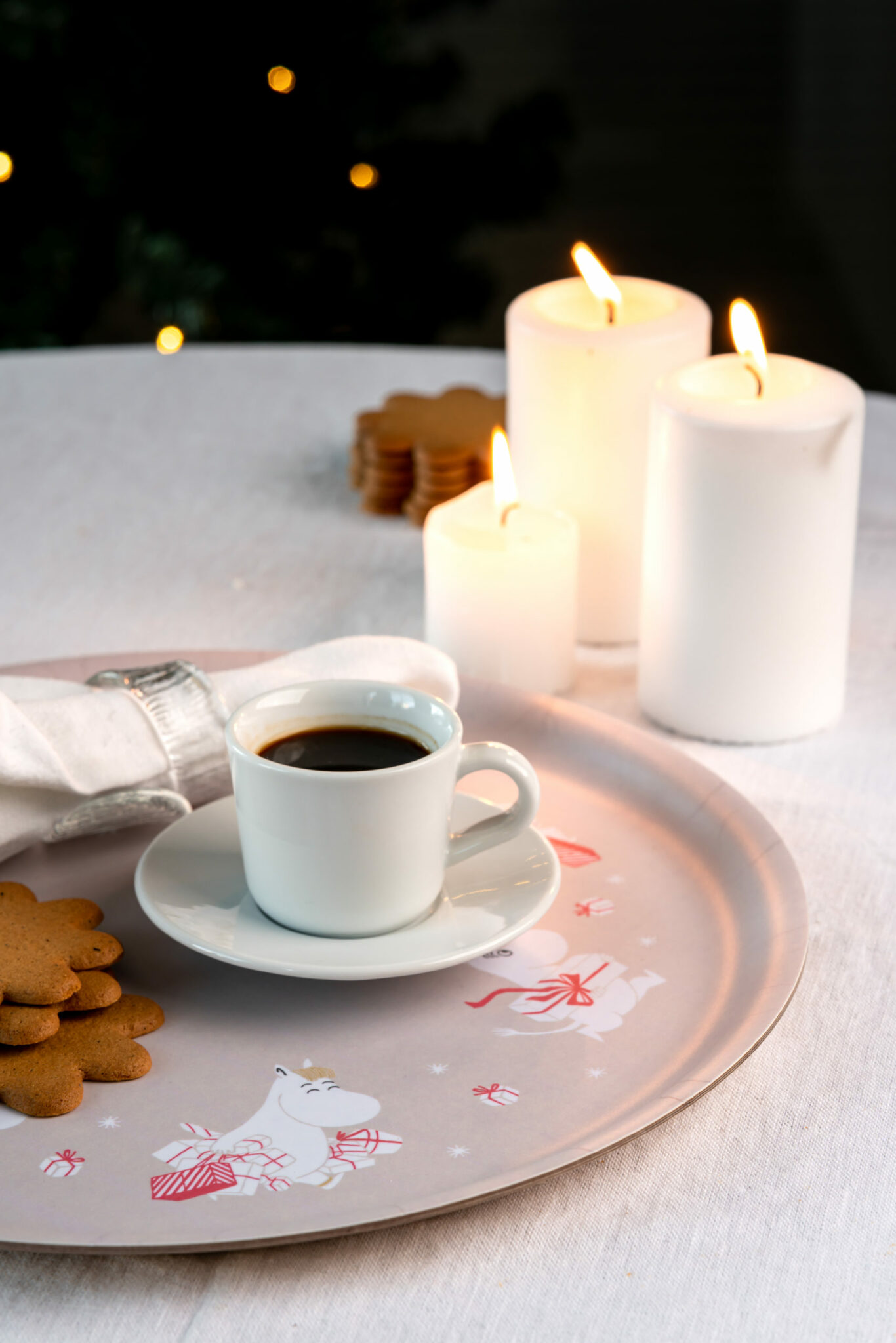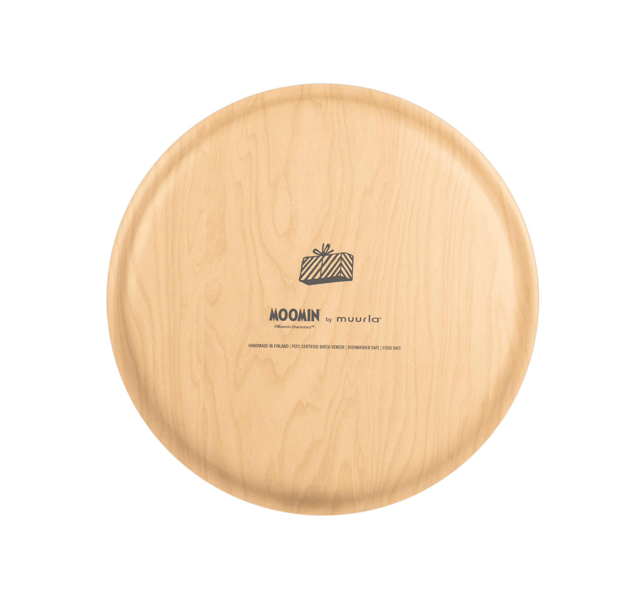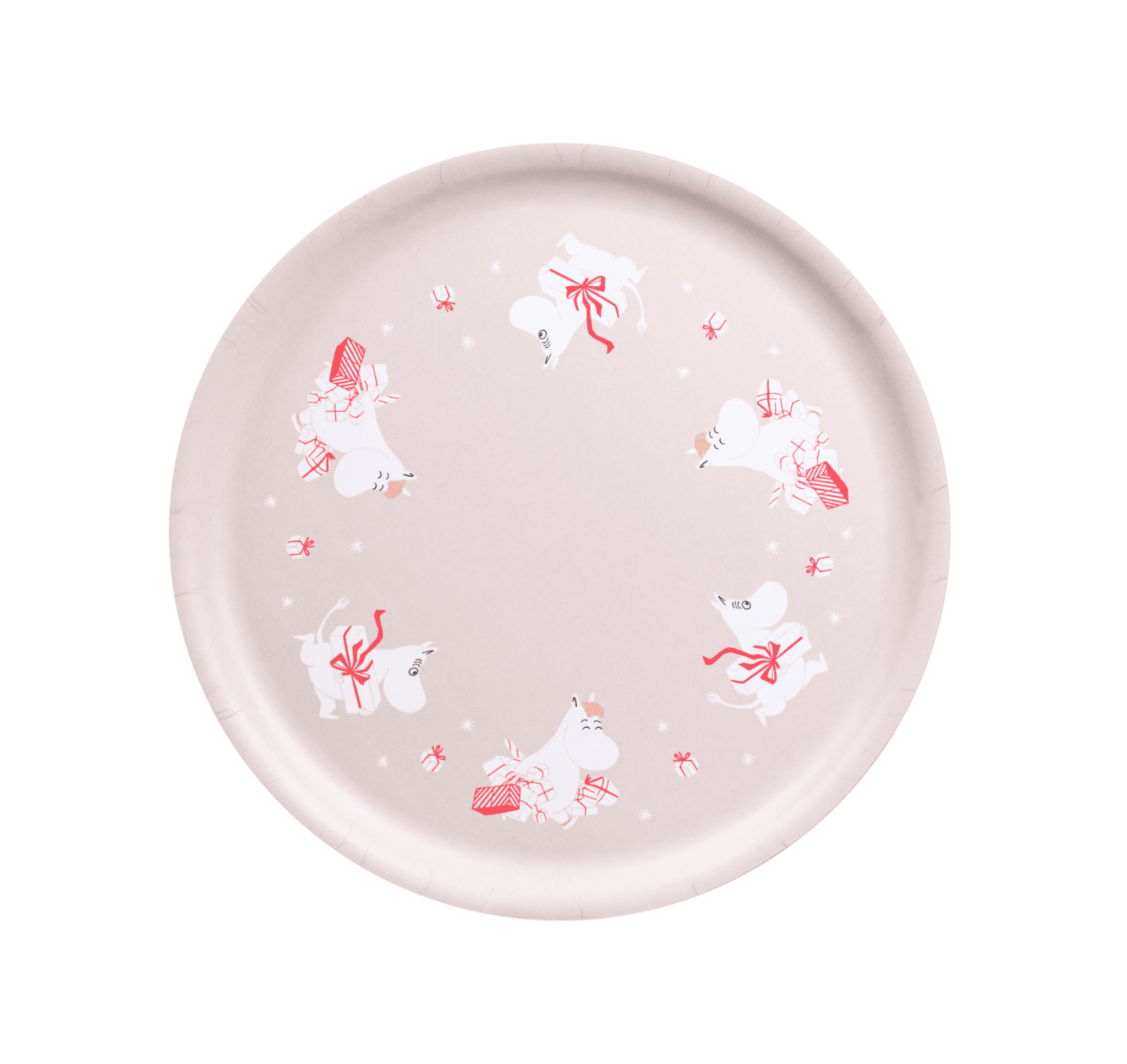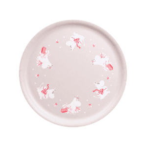 Mumin Bricka, Rund – Julklapp fin bricka med juligt motiv. En rund bricka i härliga färger och fint mönster där Mumintrollet och Snorkfröken ses skynda sig fram med klapparna, en bricka som gärna får stå framme då den inte används. Storlek: Ø 35 cm.