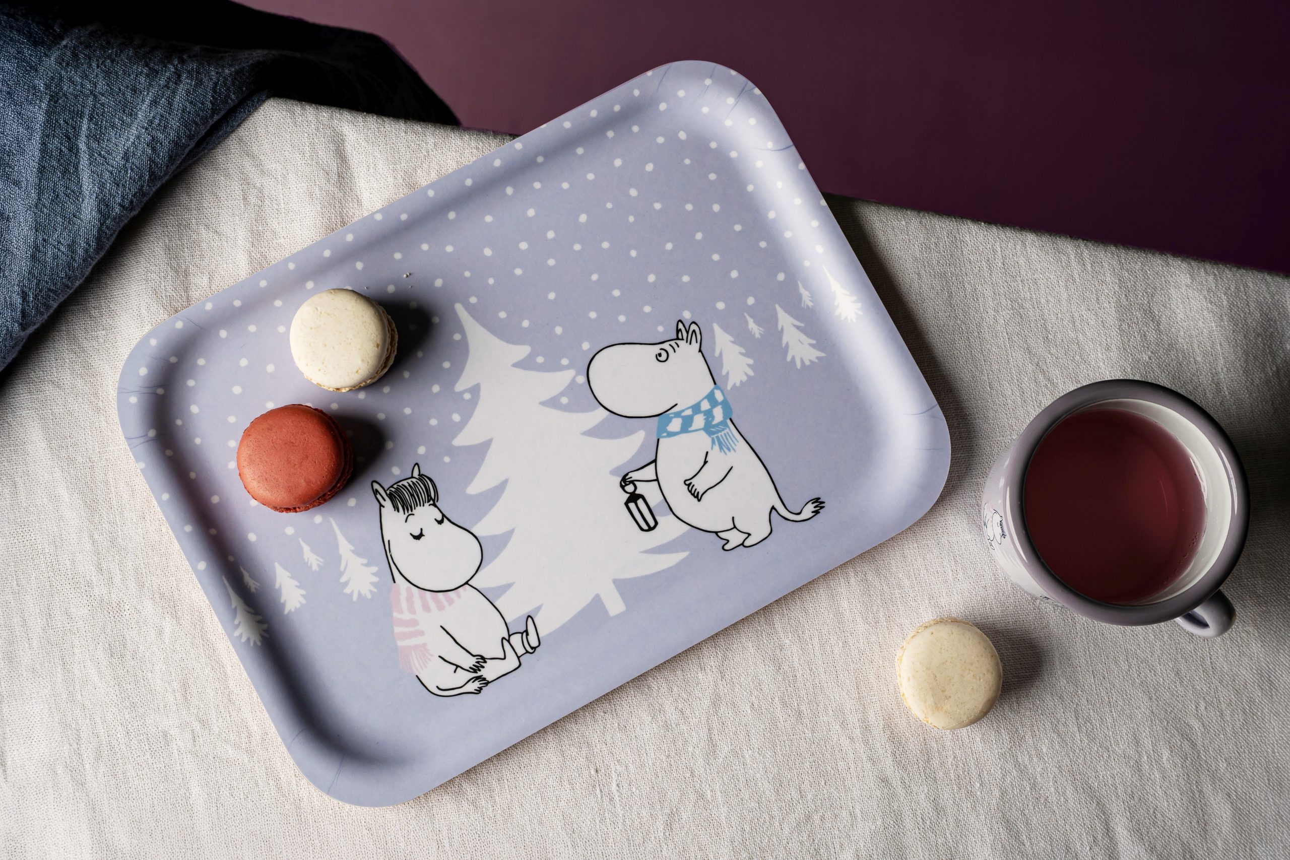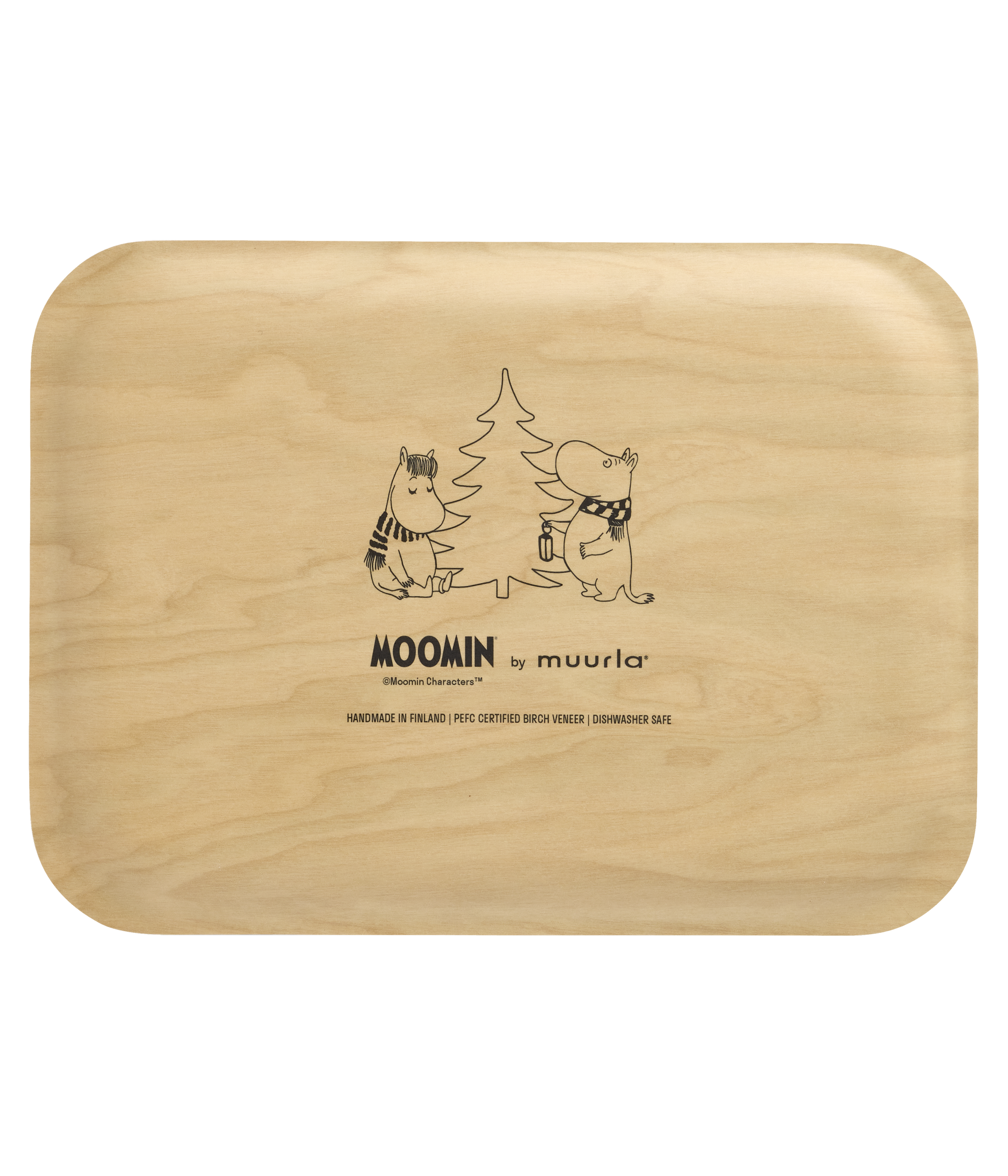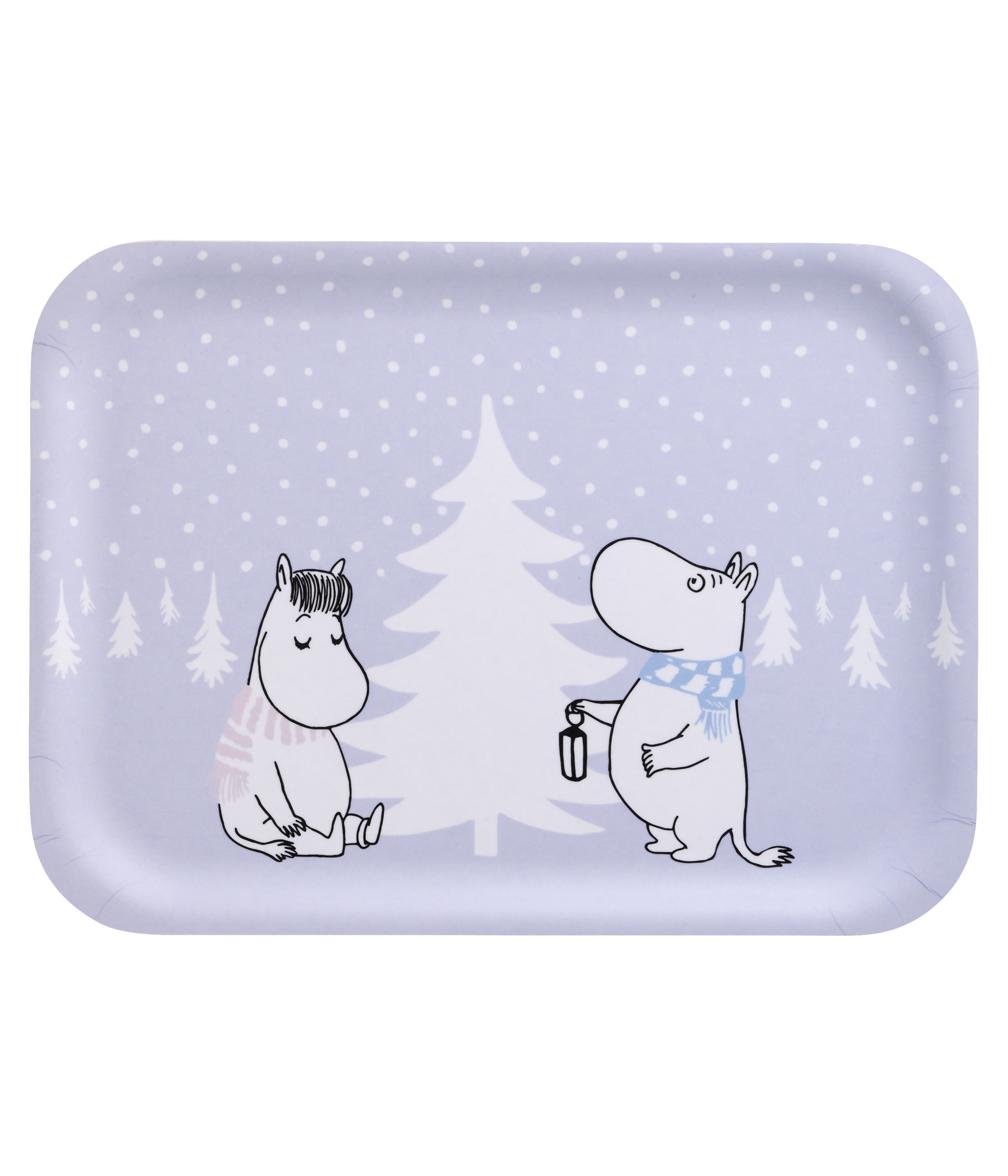 Charmig Mumin-bricka Snöfall med Mumintrollet och Snorkfröken vid en snötäckt gran. Perfekt bricka för fika, köksdekoration eller present till Mumin-vännen. En praktisk och vacker vinterbricka med Mumin och Snorkfröken som sprider mysig vintermagi. Mått: 20 x 27 cm