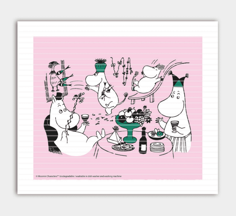 En rolig köksdetalj, Mumin Disktrasa – Mumin 80 År. Ett måste för alla som älskar mumintrollen! Härligt motiv i rosa där muminfamiljen ses fira sitt 80-års jubilemum.
