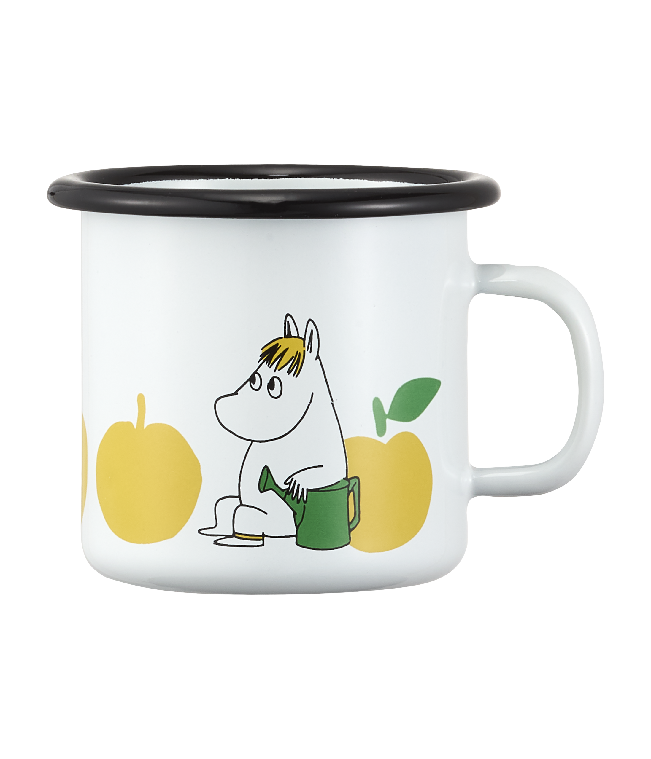 Lägstapris senaste 30 dagarna:Charmig emaljmugg på vit botten med gula äpplen runt om, här ser vi också Mumintrollet och Snorkfröken.