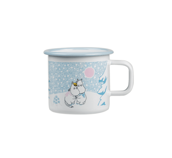Fin emaljmugg i retroinspirerad stil som visar Mumintrollet och Snorkfröken ute i snön där de byggt en snöykta, Muminmamman är på väg genom snön med en ljuslykta i handen. Rymmer 3,7 dl.