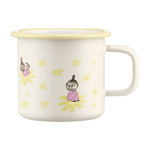 Tåliga och snygga emaljmuggar i en gammaldags stil. Muggen är tålig och lätt, vilket gör den perfekt att ta med på utflykten, ha hemma, på landet eller i båten. Klassiska muggar som är älskade av såväl vuxna som barn. Muminmugg med ljus botten gula blommor där även Lilla My ses på blombladen. Muggen tål maskindisk, men ej mikro.