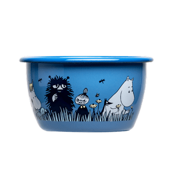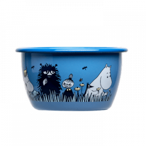 Mumin emaljskål i härligt blå färg. Skålen rymmer 3 dl. Tål maskindisk men ej microvågsugn.
