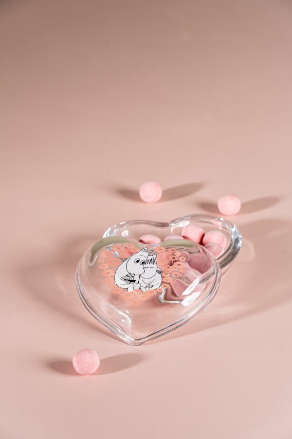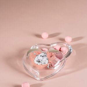 Hjärtformad glasburk med lock. Snorkfröken och Mumintrollet som myser bland blommorna. Här kan du förvara smycken, godis och viktiga småsaker. Storlek 11,5 x 10 x 5,5 cm.