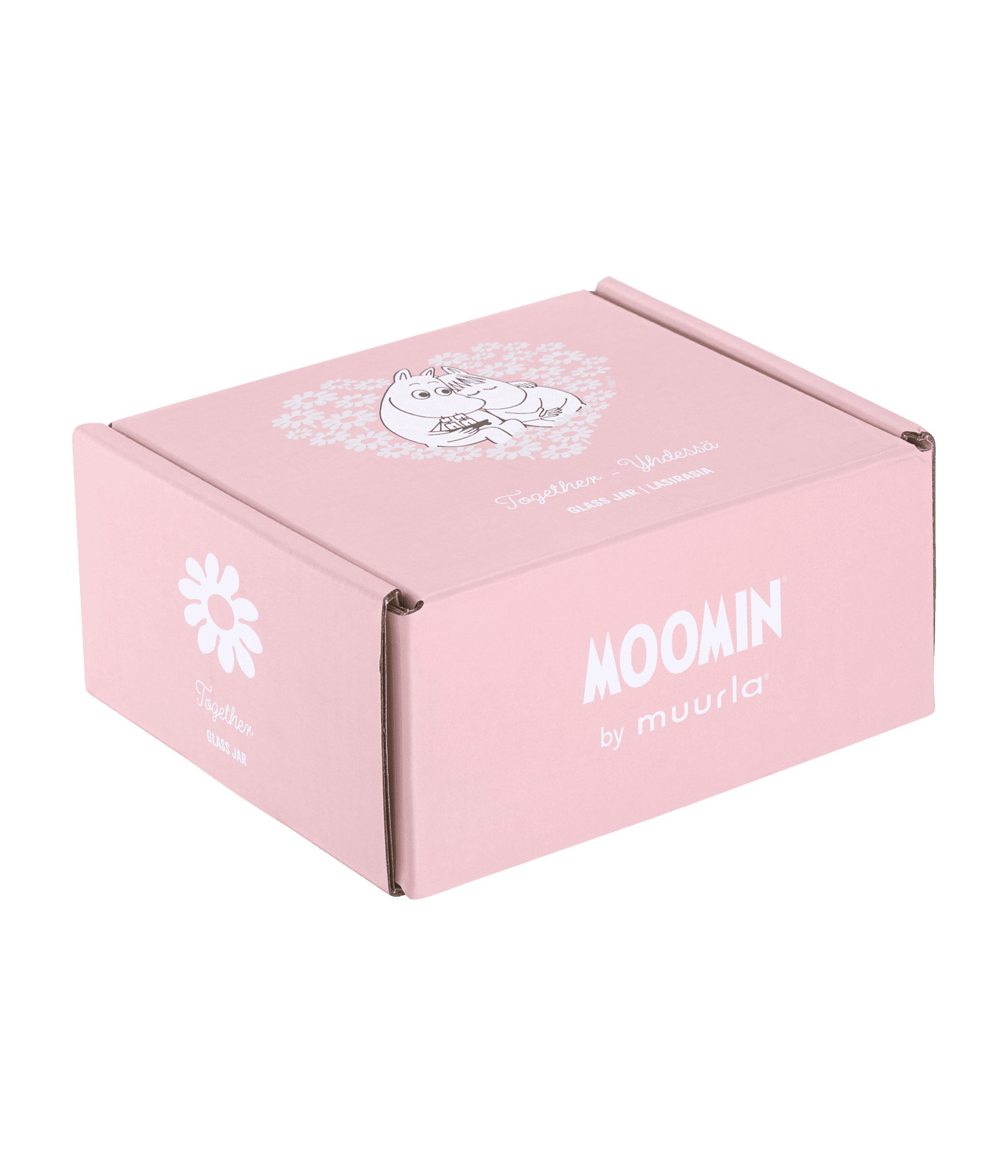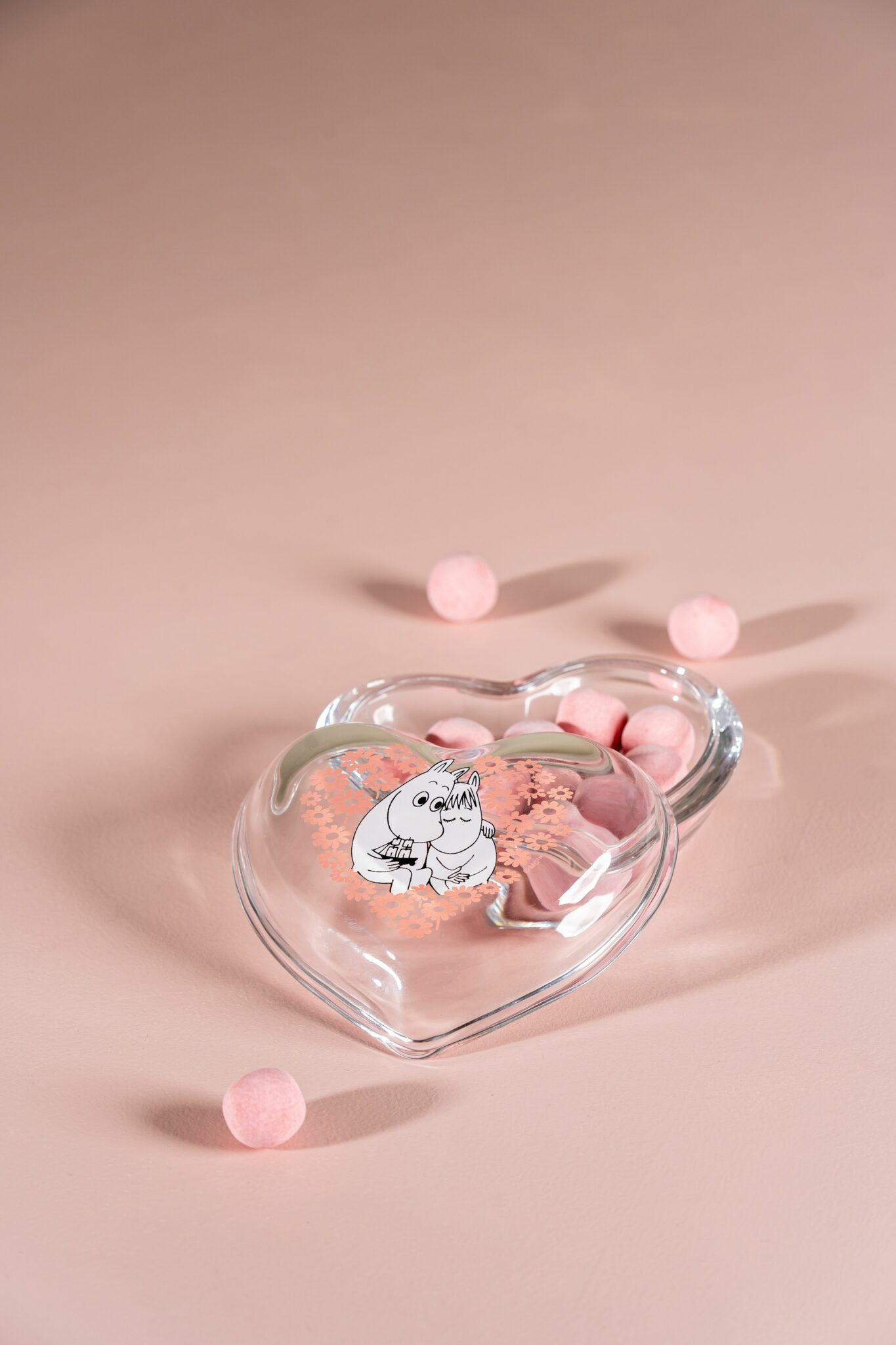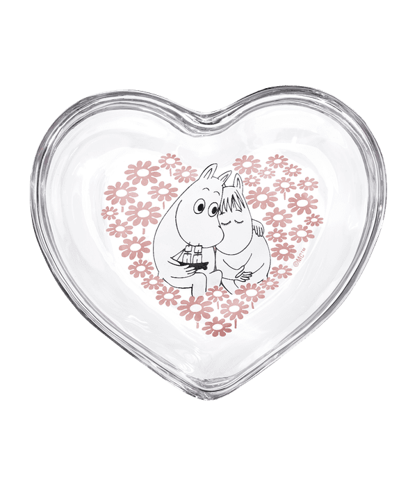 Hjärtformad glasburk i klarglas med vårt favoritpar, Mumintrollet och Snorkfröken som myser bland blommorna. Fungerar bra till smågodis, smycken och andra skatter. Levereras i fin kartong.