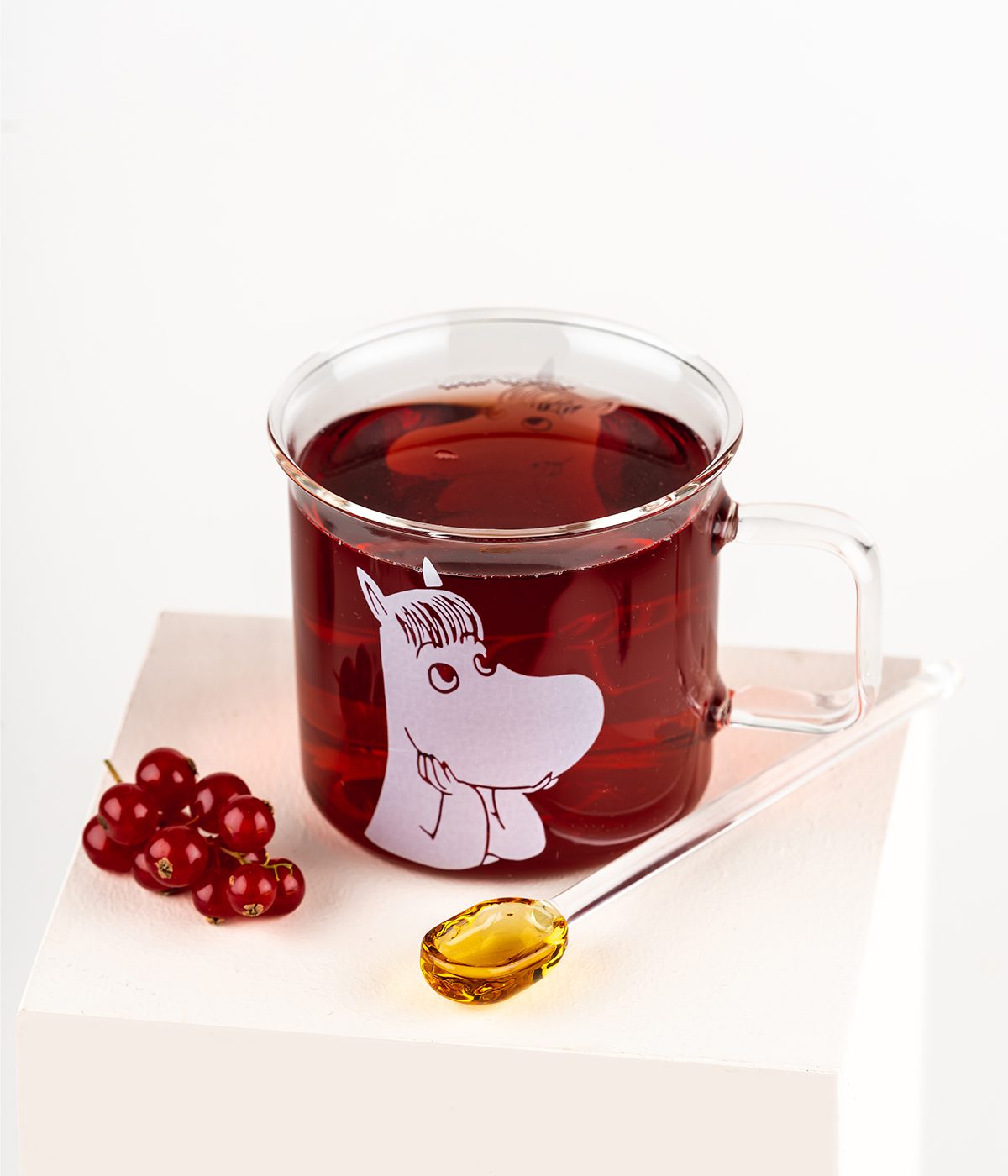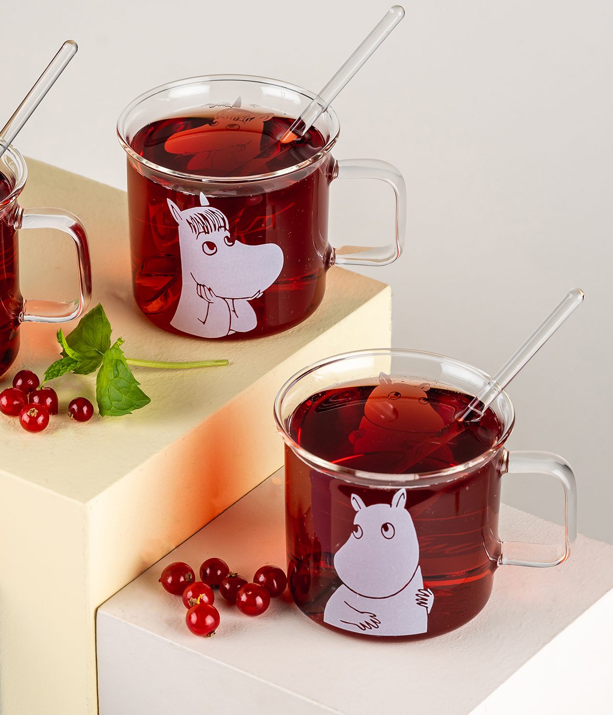Glasmugg med Snorkfröken i tåligt borosilikatglas, som är framtaget för att klara stora temperaturskillnader, från rykande hett till isklirrande kallt. Muggen rymmer 3,5 dl.