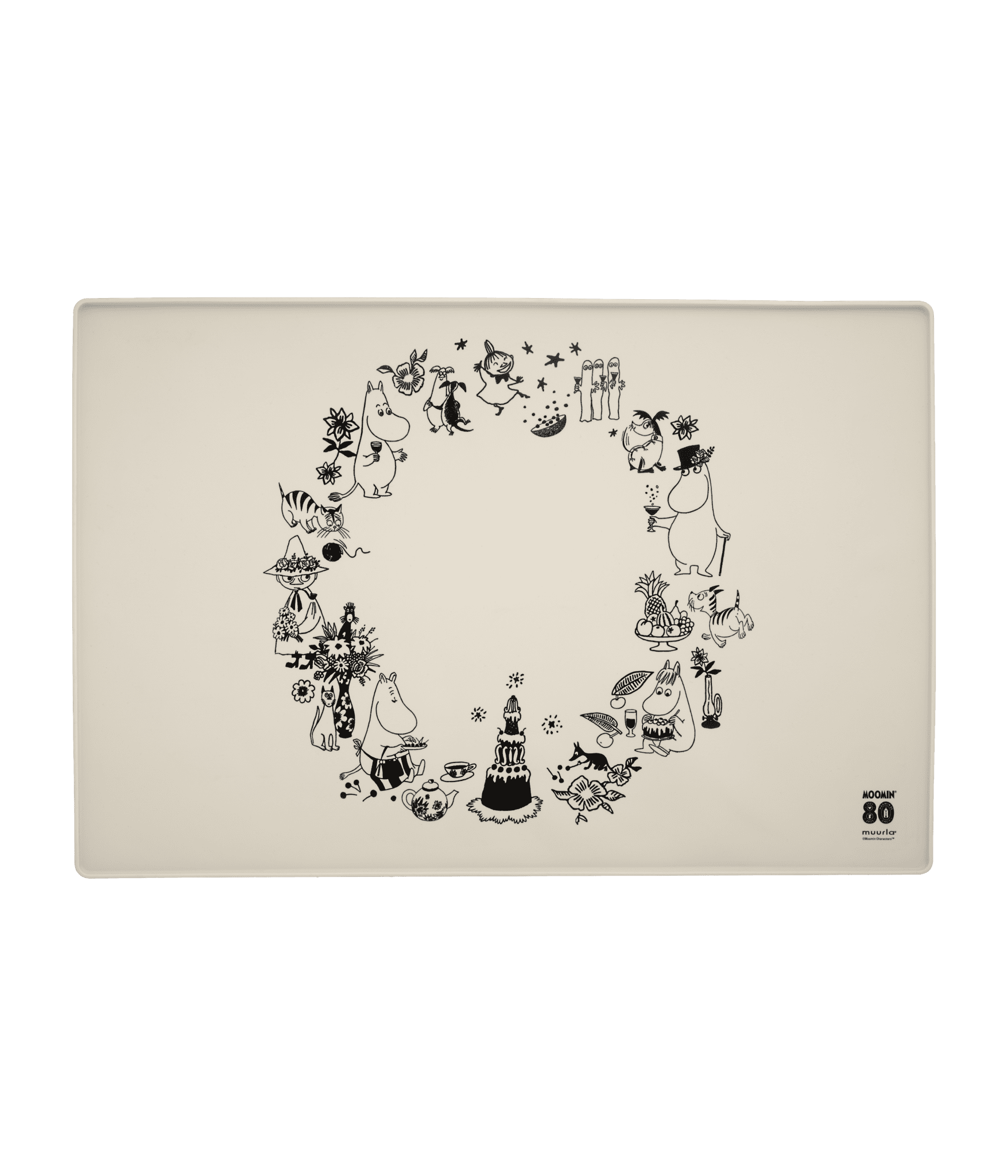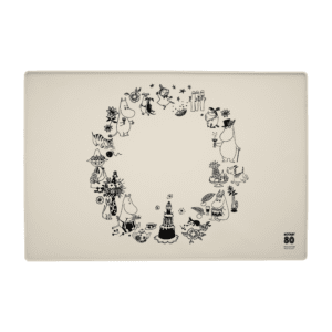 Det är klart att även våra husdjur måste få sin mat fint framdukad. Praktisk silikonunderlägg med små kanter. Hindrar matskålen från att åka runt på golvet, eventuellt vatten och spill stannar kvar på underlägget som är lätt att göra rent. Fint motiv på beige botten, framtaget till mumintrollens jubileumsår 2025 då mumintrollen fyller 80 år. Storlek 60x40cm.