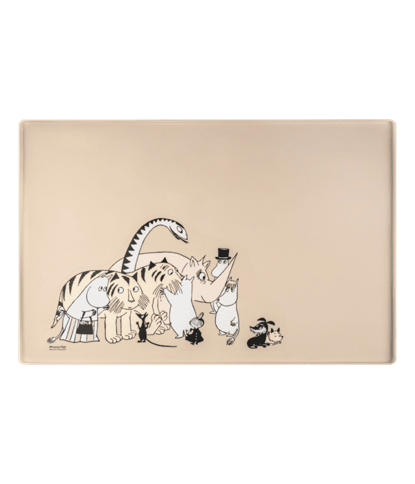 Praktiskt underlägg i silikon med små kanter. Mumin Husdjur, Underlägg i Silikon – Beige, lätt att torka av, fint mönster i beige med muminfamiljen och deras vänner tillsammans med några exotiska kompisar. Mått 60 x 40 cm.