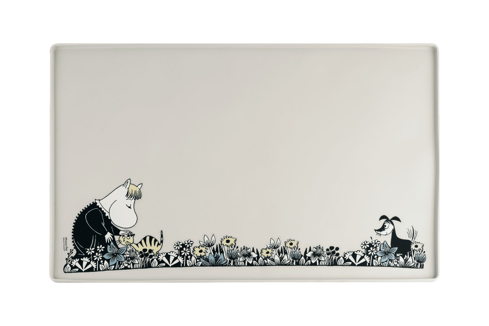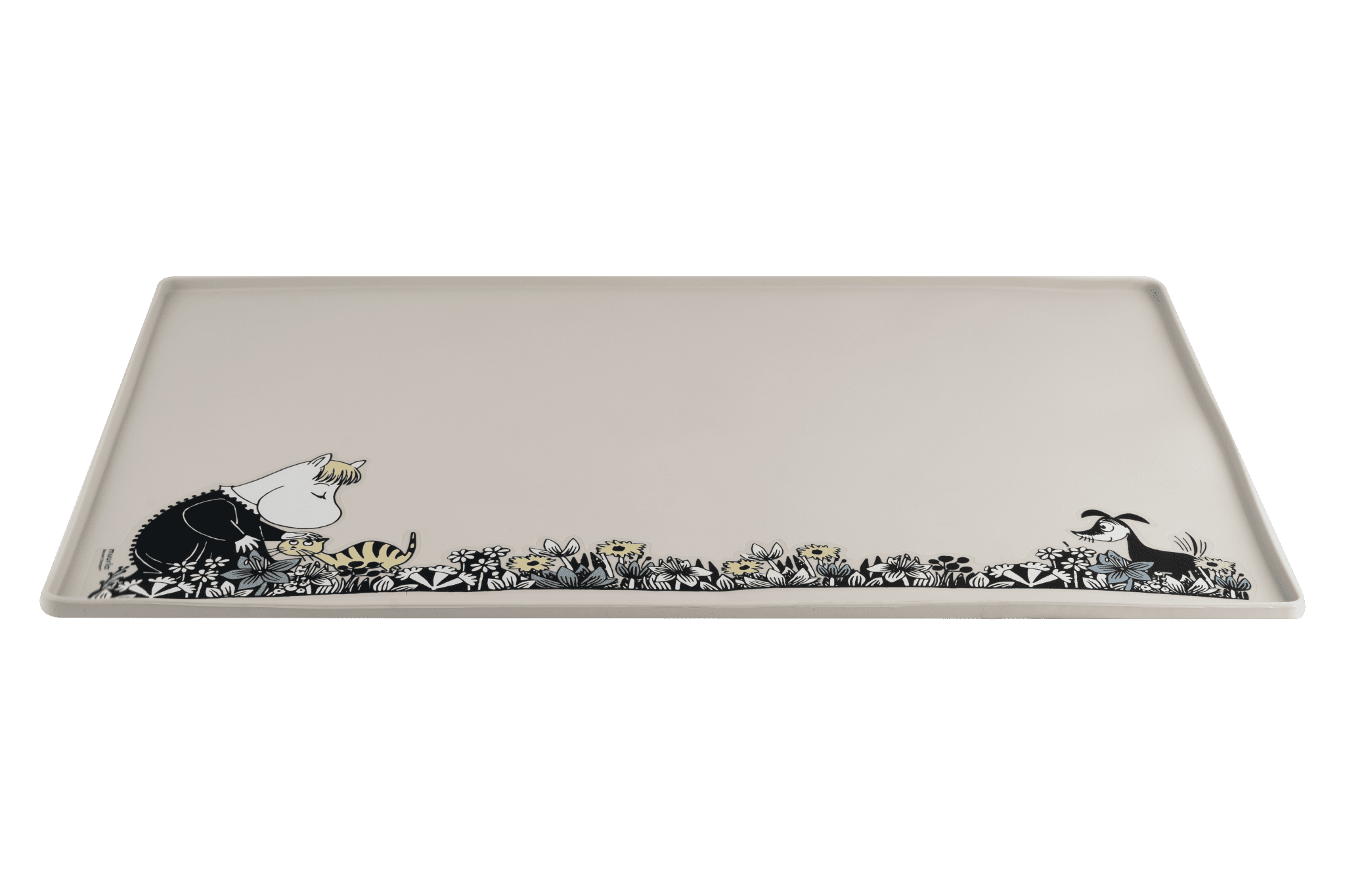 Praktiskt underlägg i silikon med små kanter. Mumin Husdjur, Underlägg i Silikon – Grå, lätt att torka av, fint mönster i grått med Snorkfröken. Mått 60 x 40 cm.