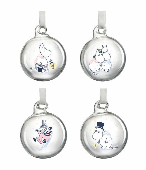 Fyra fina glaskulor med olika motiv; Mumintrollet & Snorkfröken, Muminmamma, Muminpappa och Lilla My. Julkulorna ligger paketerade i en fin presentask. Mått på julkula: 5 cm.