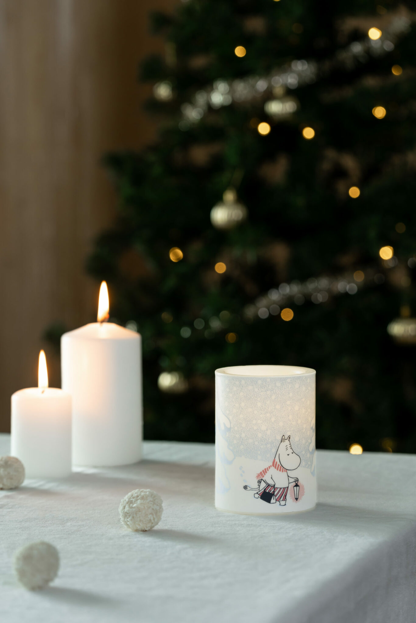 Stämningsfullt LED-ljus. Blockljus med fint mönster med mysigt sken. Använd 2 st AA batterier, timerfunktion. Mumintrollet och Snorkfröken myser i snön. Ljuset är gjort för att efterlikna ett vanligt stearin/blockljus.