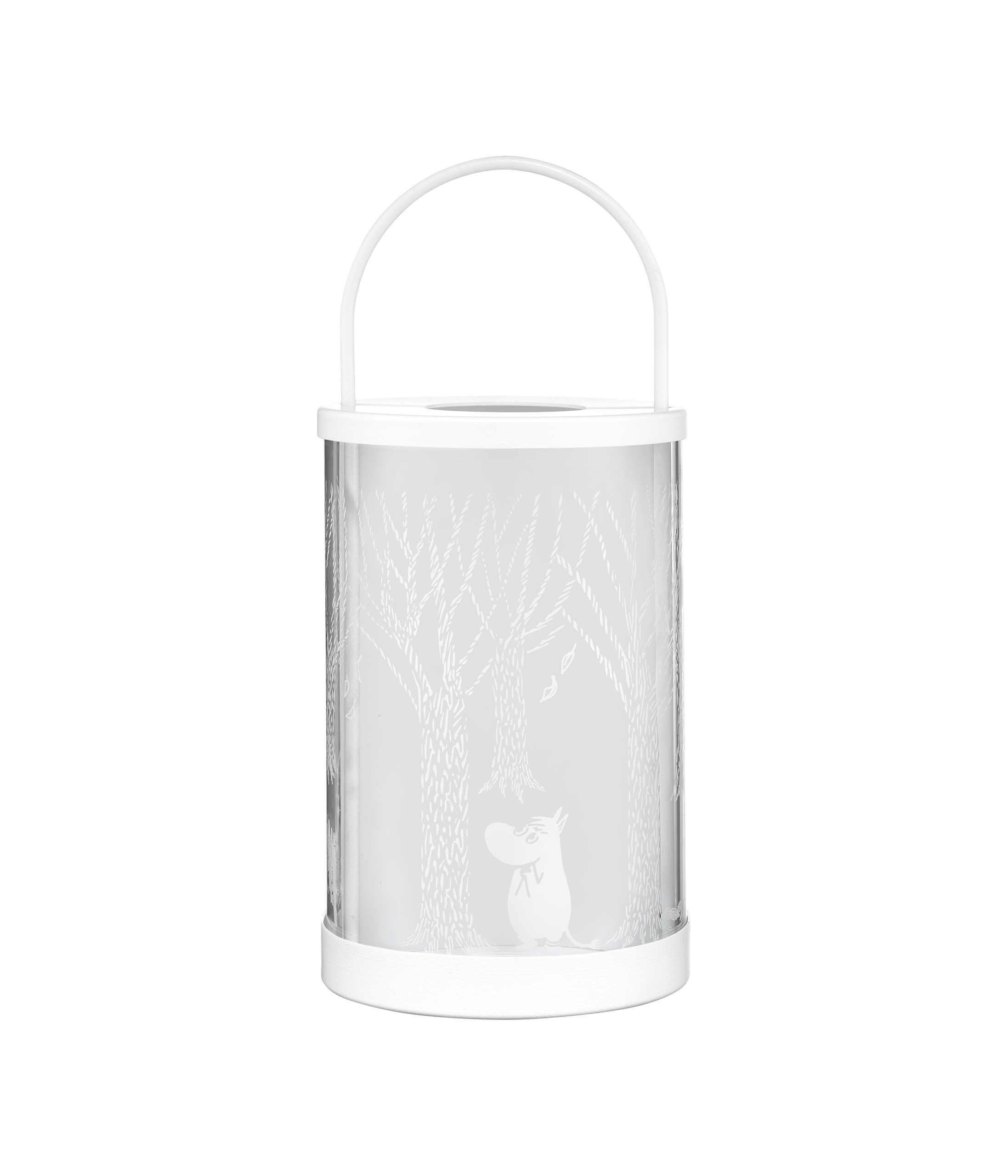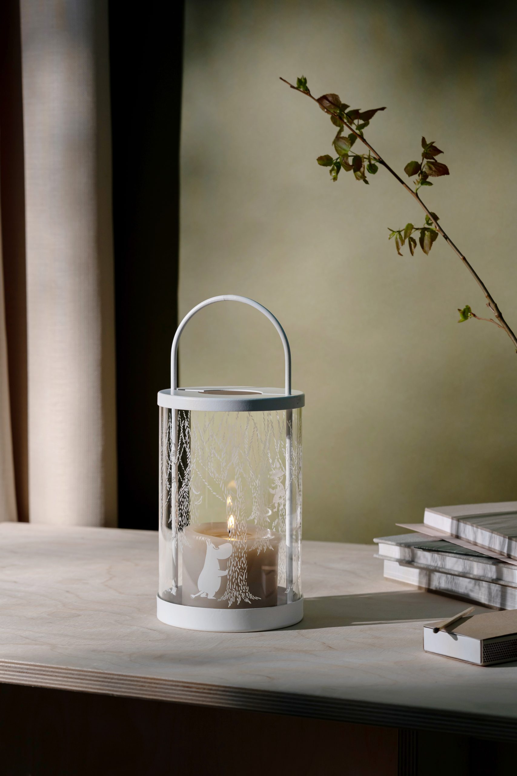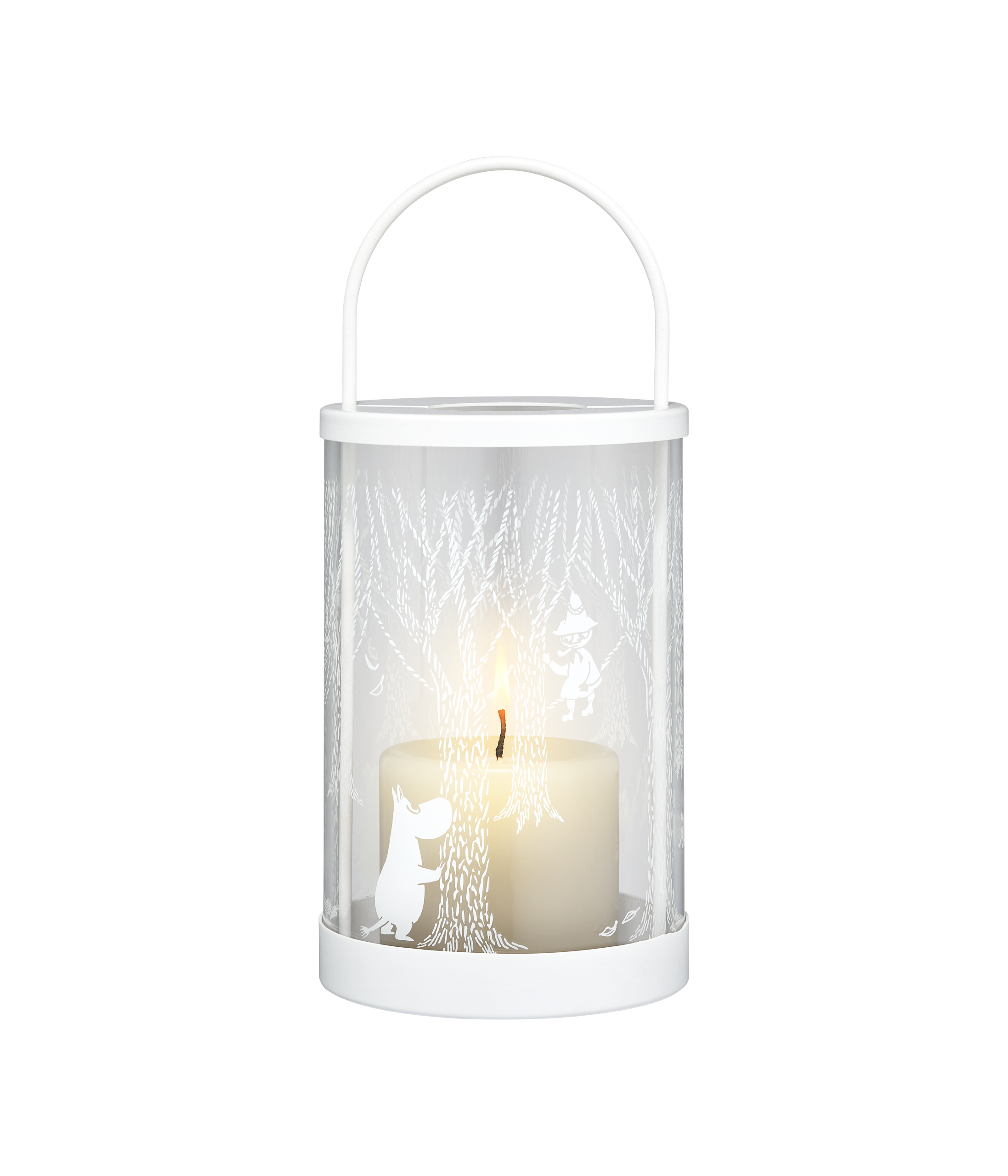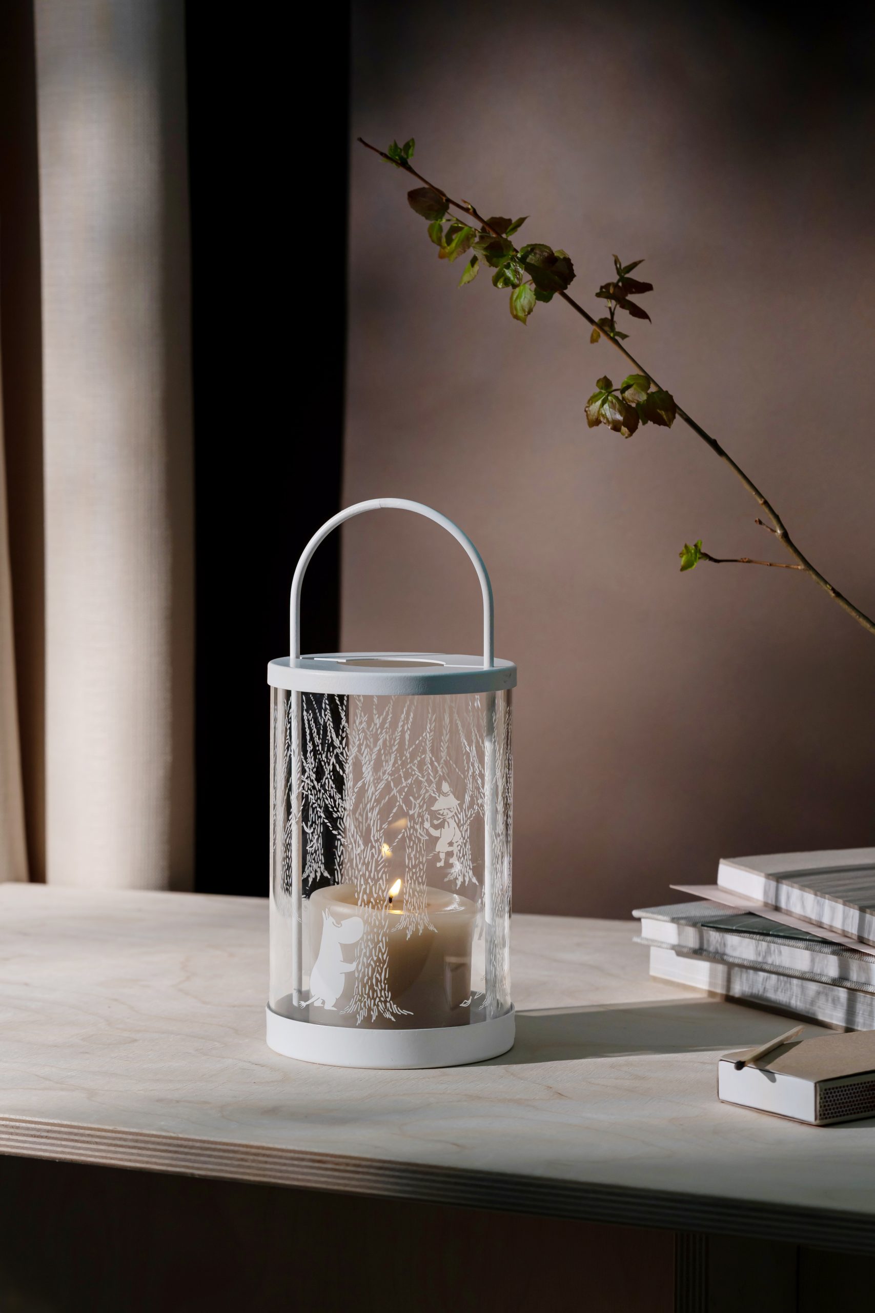 Upplev vinterns magi med denna charmiga Mumin-lykta inspirerad av Mumindalens snötäckta skogar. Med robust metallram och cylindriskt glas sprider lyktan ett varmt och mysigt sken, perfekt för inomhusbruk, utomhusbruk eller som present till Muminvännen. Ta med Mumindalens vinterstämning hem och skapa en stämningsfull atmosfär under hela vintern.. Tänk på att handtaget kan bli varmt när du har ett tänt ljus. Höjd 18 cm (med handtaget 26 cm)