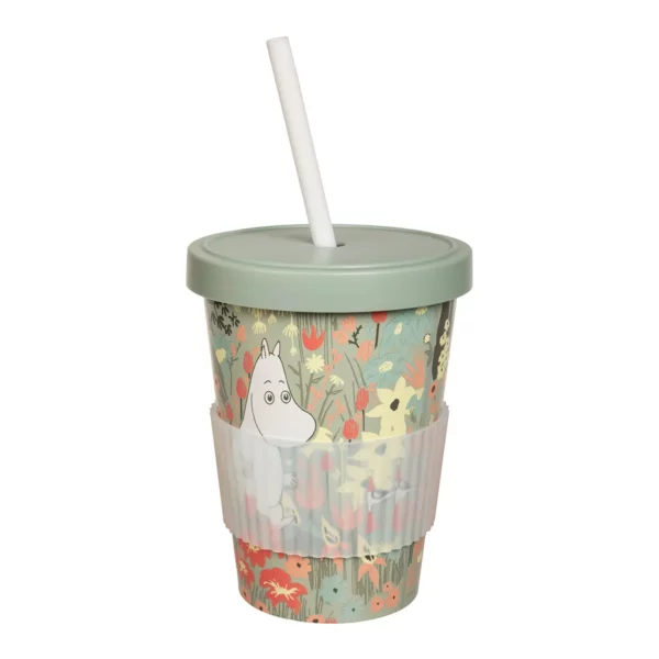 En ljusgrön sugrörsmugg med lock, tillverkad i återvunnen plast, med fint muminmotiv. Tål maskindisk och varma drycker (70°C). Förvara muggen stående, då den inte här helt tät kring sugröret. Sugröret har en liten ring i nedre änden för att förhindra att det faller ut. Praktisk mugg på sommaren då du inte riskerar kryp i ditt glas. Kontrollera dock alltid sugröret så ingen geting satt sig där.