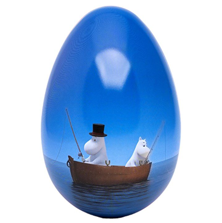 Mumin Påskägg i Plåt – Fiskar, 2 storlekar. Fantastiska öppningsbara påskägg i plåt som går att återanvända år efter år. Fint motiv blått med Mumintrollet och Muminpappan ute på en fisketur. Ägget finns i två storlekar, 15 och 18 cm.