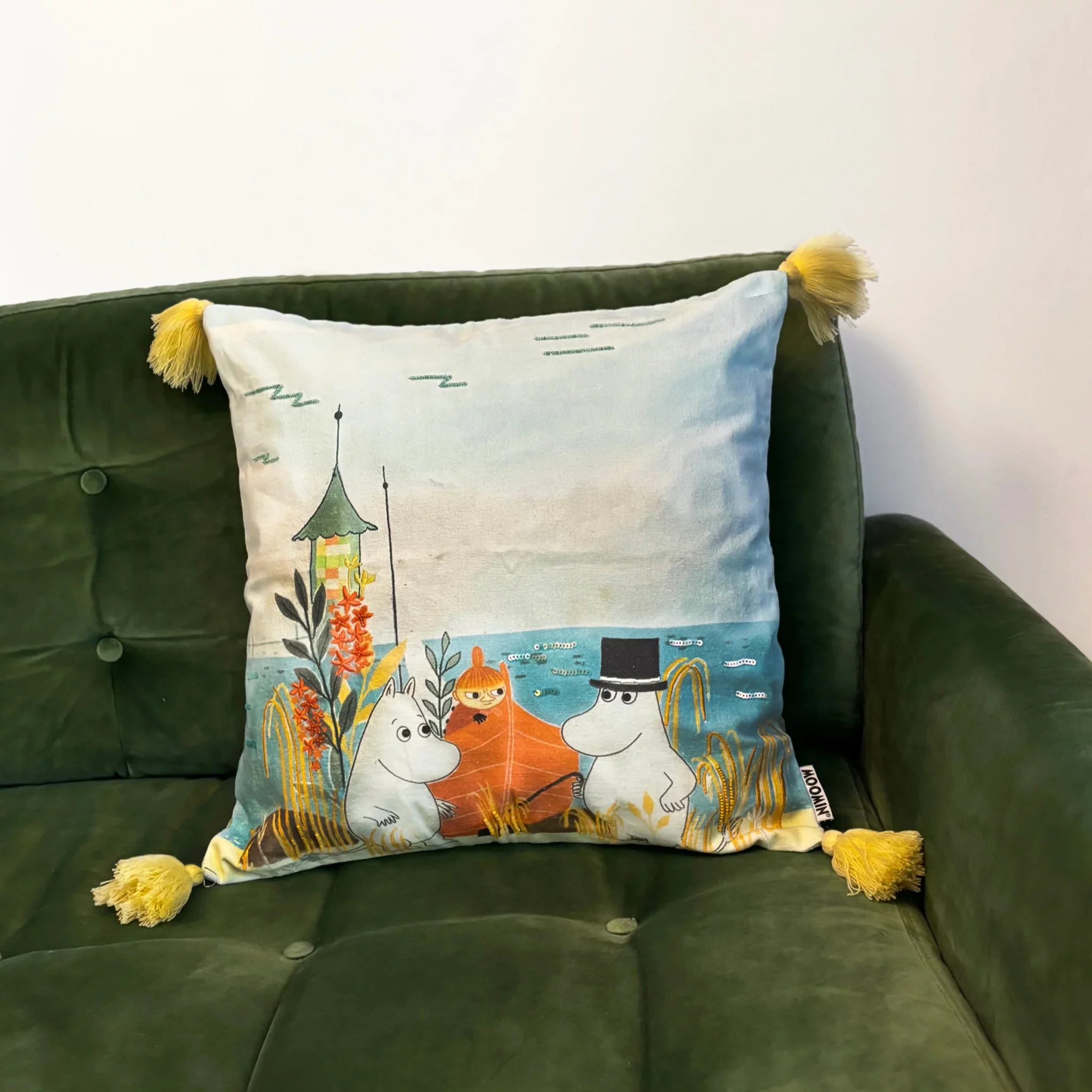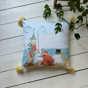 En riktigt fin kudde för soffa, säng eller varhelst du önskar en snygg kudde i härlig färg! I vackra toner av mjukt blått med sandfärgade tofsar ser vi Mumintrollet, Muminpappan och Lilla My en härliga dag på stranden. Fina pärl- och paljett detaljer ger kudden extra liv. Innerkudde ingår. Mått 45 x 45 cm.