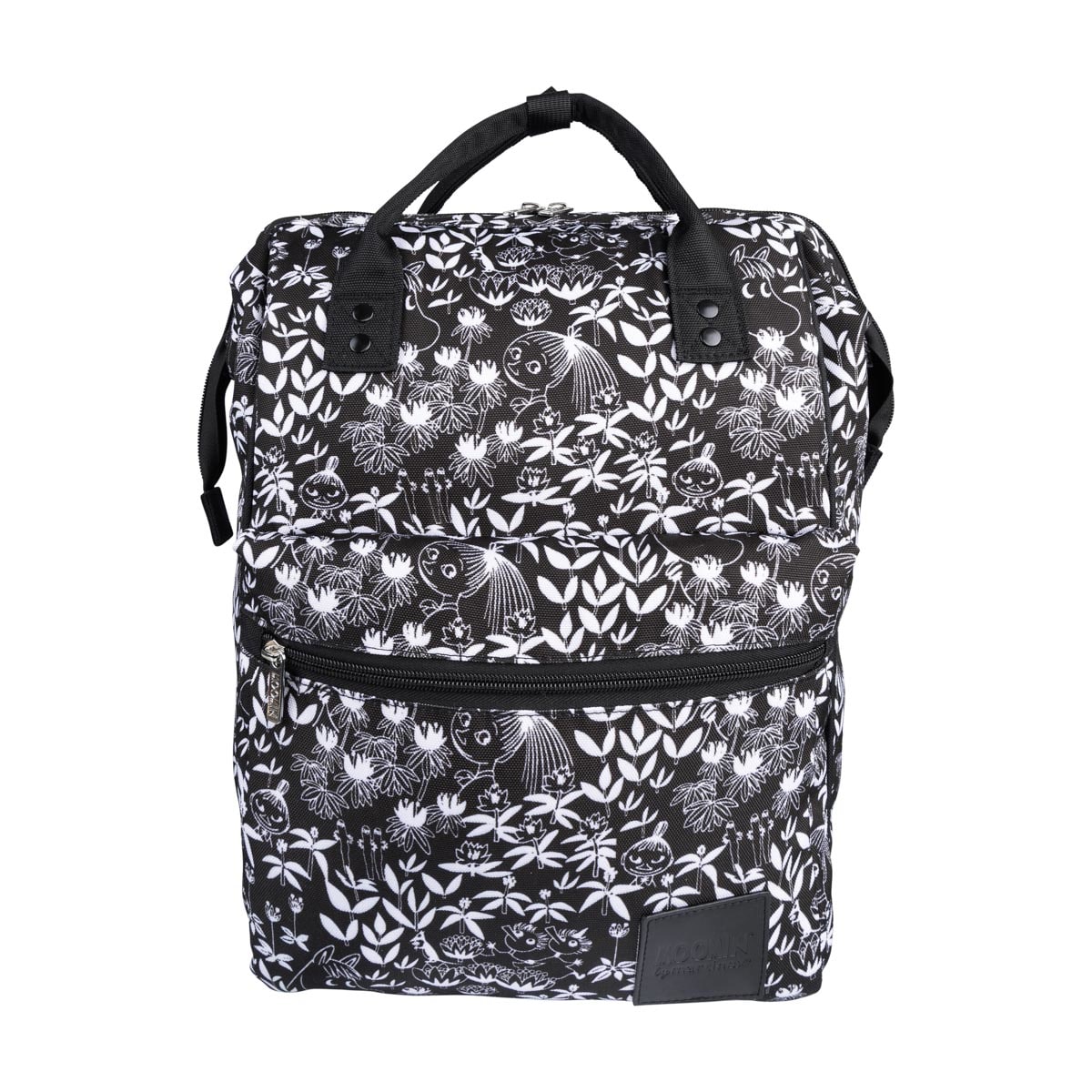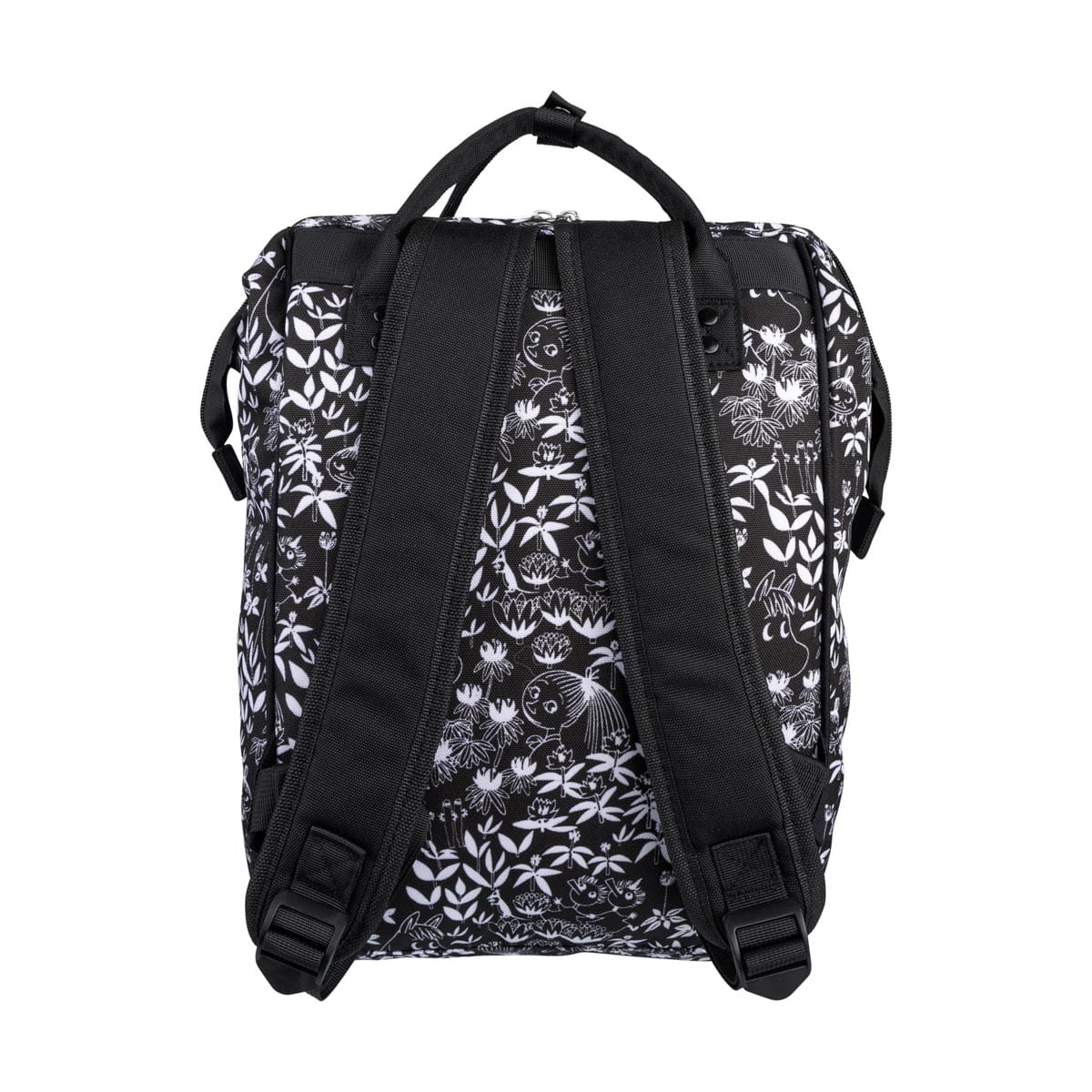 Snygg, rejäl och praktisk ryggsäck i fint muminmönster. Svart/vit mönster där flera av Mumindalens vänner syns bland blommorna.