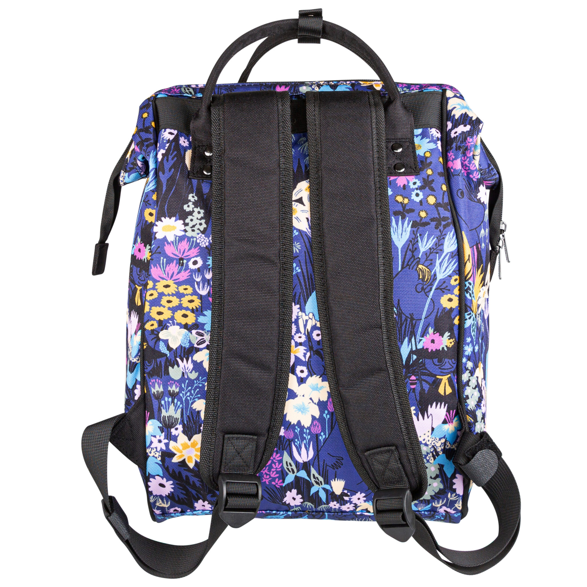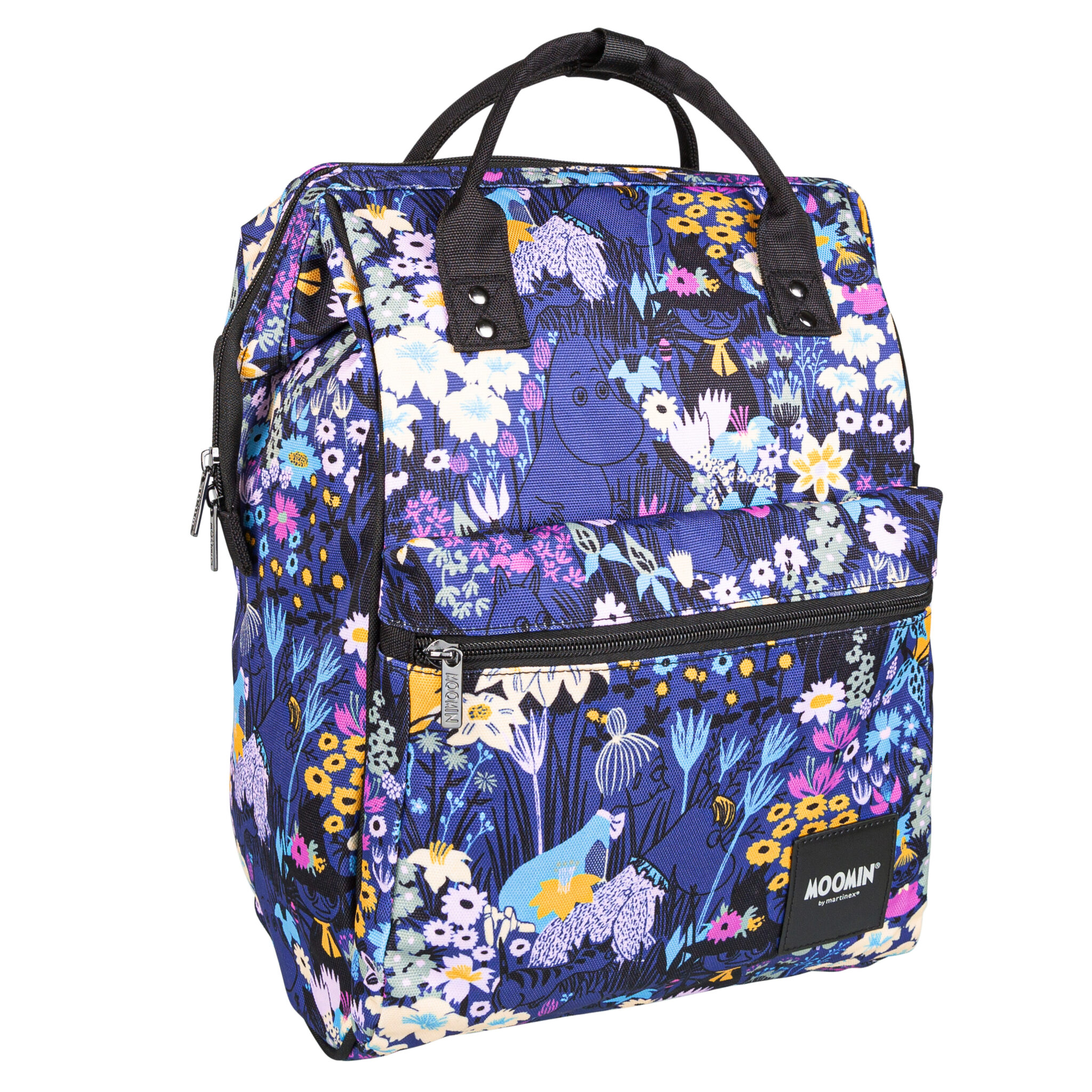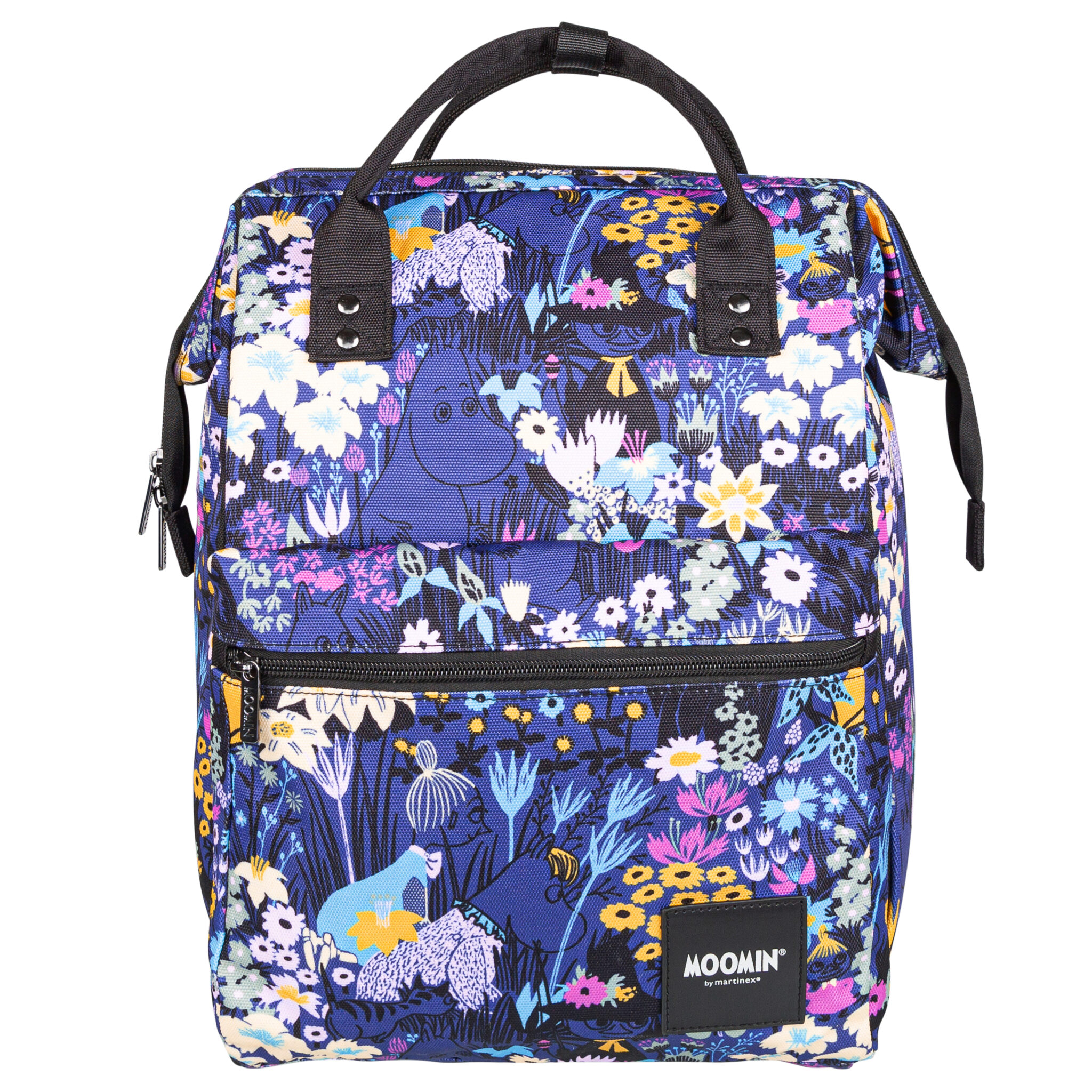 Snygg, rejäl och praktisk ryggsäck i fint muminmöster. Blå/lila mönster där flera av Mumindalens vänner syns i ett hav av blommor.