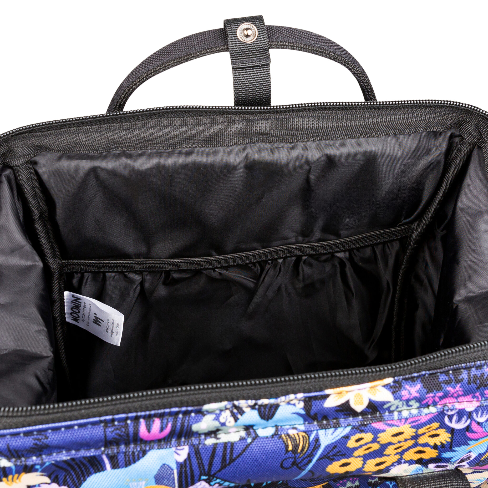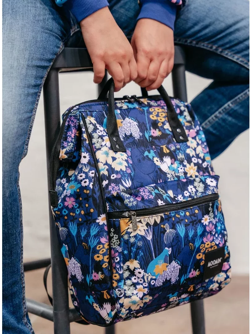 En stadig och fin Mumin ryggsäck – Smörblomma, Blå, i polyestercanvas, helmönstrad med flera av Mumindalens invånare bland vackra blommor. Denna praktiska och rymliga ryggsäck öppnas upptill med dubbla dragkedjor och den viker upp sig helt och hållet tack vare den tunna metallramen som är insydd runt öppningen. Inuti är ryggsäcken fodrad i svart och det finns ett fack med elastisk kant in mot ryggen, som har en lätt stoppning. Framsidan har också en lätt stoppning och en ytterficka med dragkedja. Ryggsäcken är vattenavvisande och den har justerbara, vadderade axelremmar i svart, med ett bärhandtag upptill. Volym ca 15 liter.