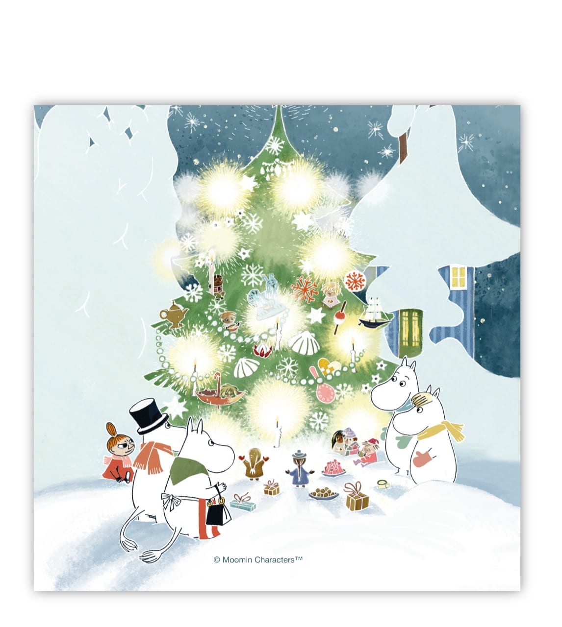 Mumin Servetter Christmas Tree. Underbara servetter i behagliga färger där Muminfamiljen och Lilla My samlats kring en vackert lysande julgran. Ett måste för Muminälskaren!