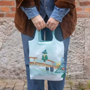 Praktisk shoppingkasse i behagliga färger och fint motiv, i en lite mindre modell. Mönster med Mumintrollet och Snusmumriken som sitter och funderar och samtalar på en bro. Smidigt kasse du viker ihop och förvarar i den lilla förvaringsfodralet, bär med shoppingbagen i handväskan eller jackfickan. Mått 30×48 cm.