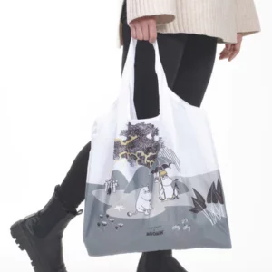 När du vill ha en riktigt praktisk shoppingkasse skaffar du denna kasse i lite större modell. Vik ihop den och se till att alltid ha med en i handväskan eller i fickan. Motiv med Mumintrollet, Snorkfröken och Hattifnattarna på en öde ö.