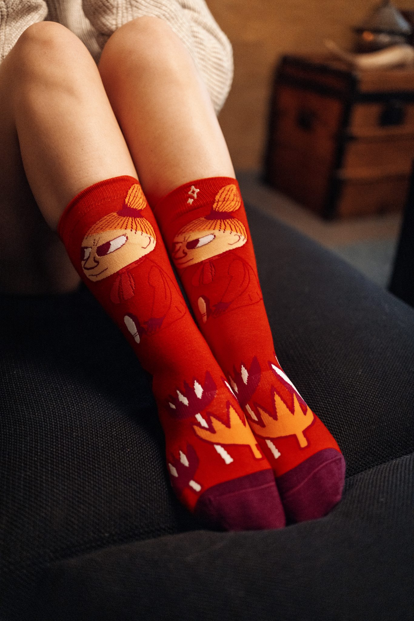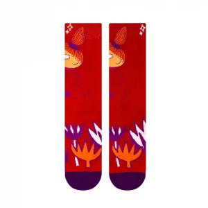 Snygg strumpa med lekfullt motiv i härliga färger. Högkvalitativ strumpa från norska NVRLND, Mumin Strumpor med Lilla My i en härligt röd färg, storlek 36-40.