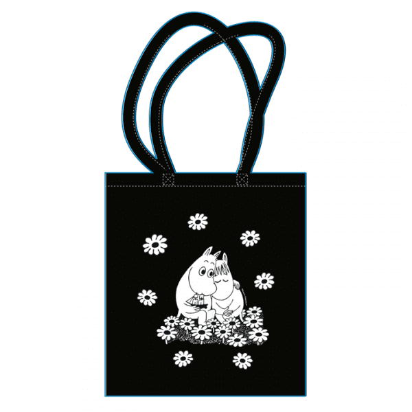 Praktisk Mumin tygpåse för shoppingturen . Fin shoppingkasse i svart tyg och svarta sömmar, med ett av våra mest populära motiv. Bärhandtag för axeln. Mått: 38×42 cm.