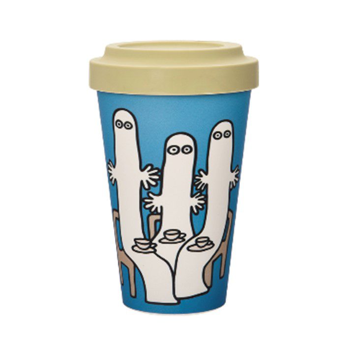Fin Mumin Take Away Mugg i blått med Hattifnattarna. Silikonlock i beige.Muggen är tillverkad i PLA, ett helt biologiskt nedbrytbart och fossilfritt material som ser ut som plast men innehåller INGEN fossilbaserad plast alls, bra för dig och vår natur. Rymmer 450 ml.