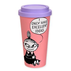 Fin Mumin Take Away Mugg med Lilla My och texten ”I only have excellent ideas”. Muggen är tillverkad i PLA, ett helt biologiskt nedbrytbart och fossilfritt material som ser ut som plast men innehåller INGEN fossilbaserad plast alls, bra för dig och vår natur. Rymmer 450 ml.