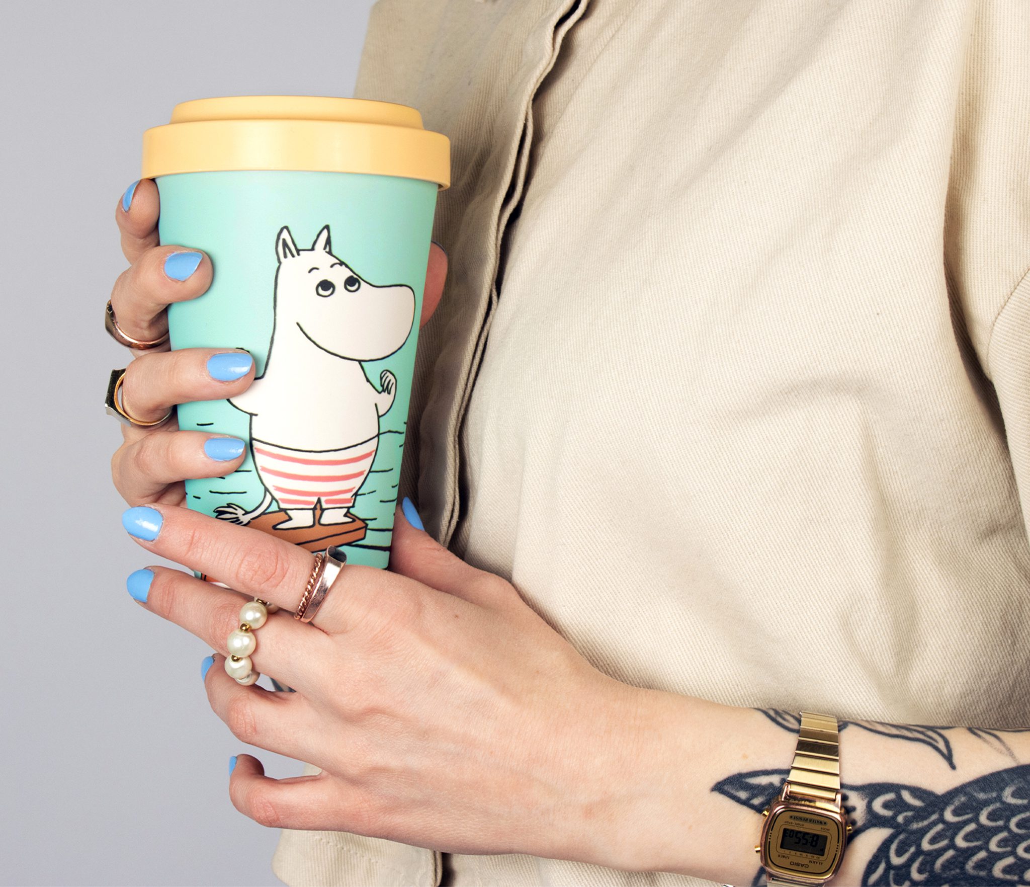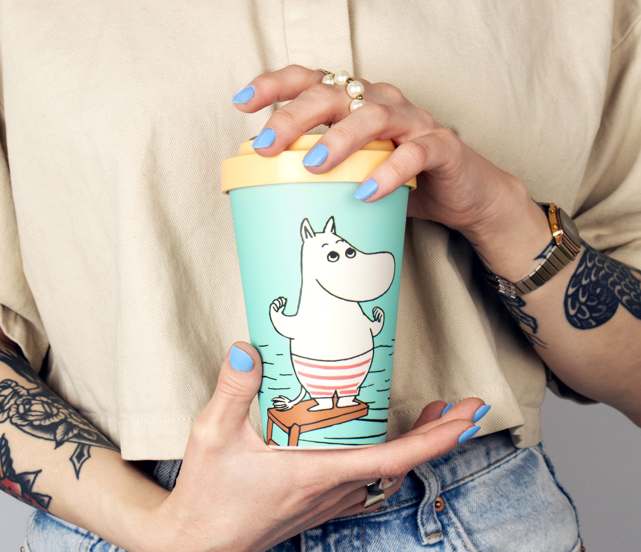 Fin Mumin Take Away Mugg i turkost med Mumintrollet redo för ett dopp. Beige silikonlock, muggen är tillverkad i PLA, ett helt biologiskt nedbrytbart och fossilfritt material som ser ut som plast men innehåller INGEN fossilbaserad plast alls, bra för dig och vår natur. Rymmer 450 ml.