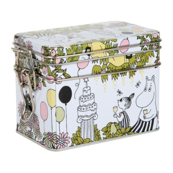 Fin teburk i plåt med tättslutande snäpplock. Fint motiv i behagliga färger där mumindalens vänner ses på kalas i den lummiga trädgården. Handdiskas och noggrann torkning.