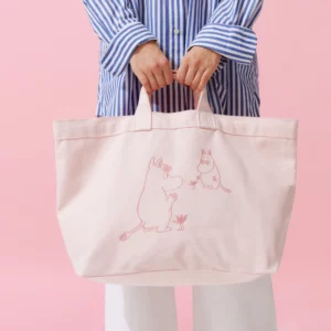 Fin muminväska i GOTS certifierad bomull i kärleksfullt mönster. Stadig bomullsväska i rosa med motiv med Mumintrollet och Snorkfröken. Storlek: botten är 35 cm bred och bredden upptill är 55 cm. Höjden 35 cm. Lägg till lite kärlek i ditt liv!