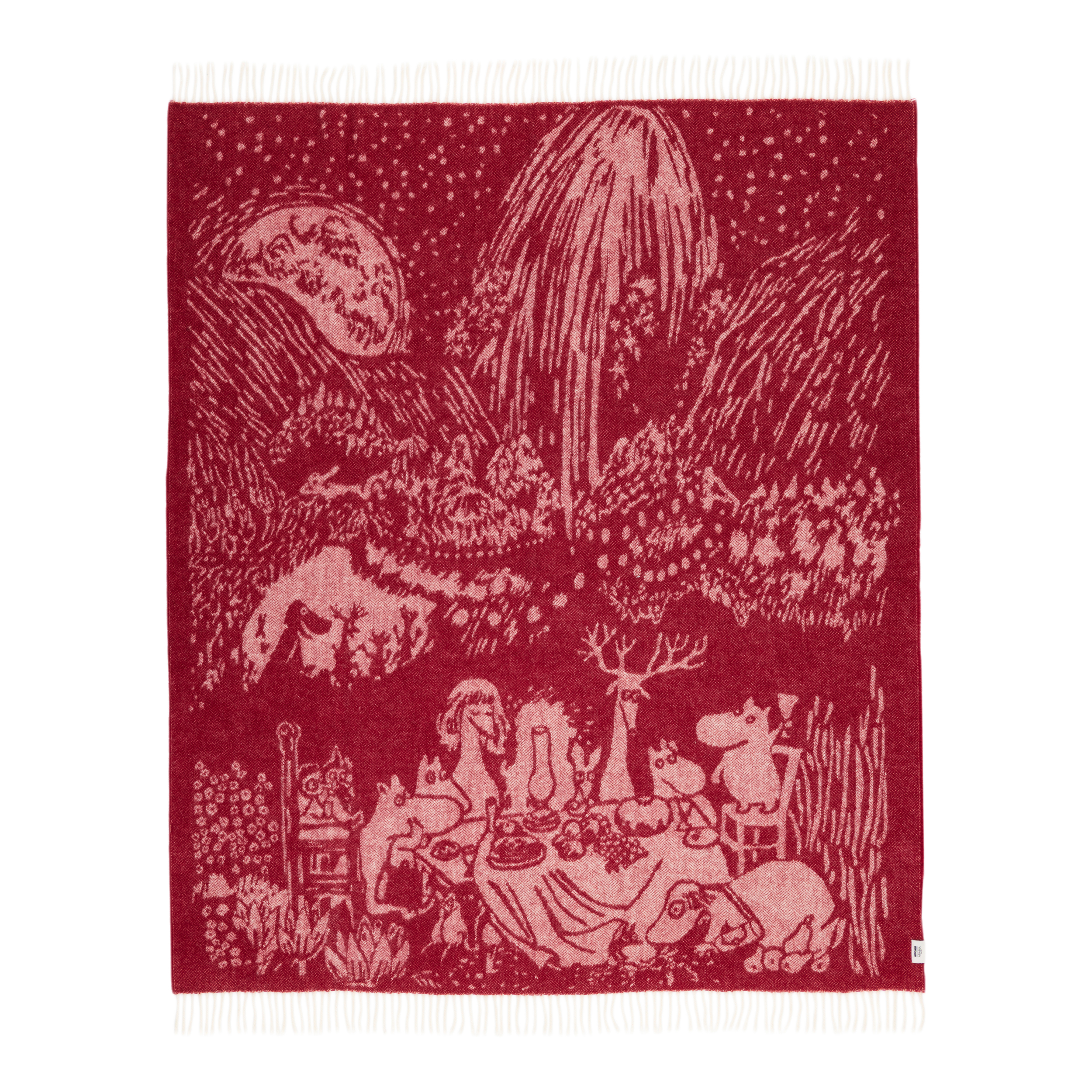 Mjuk ullpläd från Moomin Arabia i vackert mörkt röd nyans med vita fransar och en illustration från Tove Janssons roman Trollkarlens Hatt. Denna speciella illustration hyllar gemenskap och tacksamhet mot vänner, var de än befinner sig.– blir fin i soffan, sängen eller som en stilren inredningsdetalj, som en stor muminkram – perfekt för lugna stunder i hemmet.