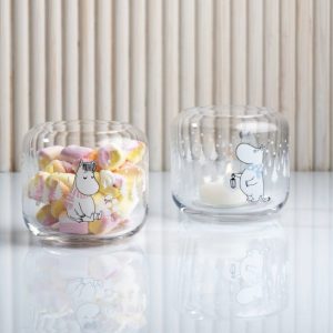 Fin ljuslykta i glas med vintrigt motiv. Snorkfröken på ena sidan och Mumintrollet på den andra. Du köper ljuslyktorna styckevis.