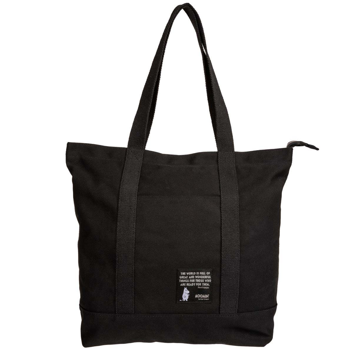 Snygg, stadig och praktisk Mumin väska i svart bomullscanvas, med svart handtag som går att bära både i handen eller över axeln. Liten applikation med Mumintrollet och det silverglittrande citatet ’The world is full of great and wonderful things for those who are ready for them’. Mått: 40 x 35 x 13 cm.