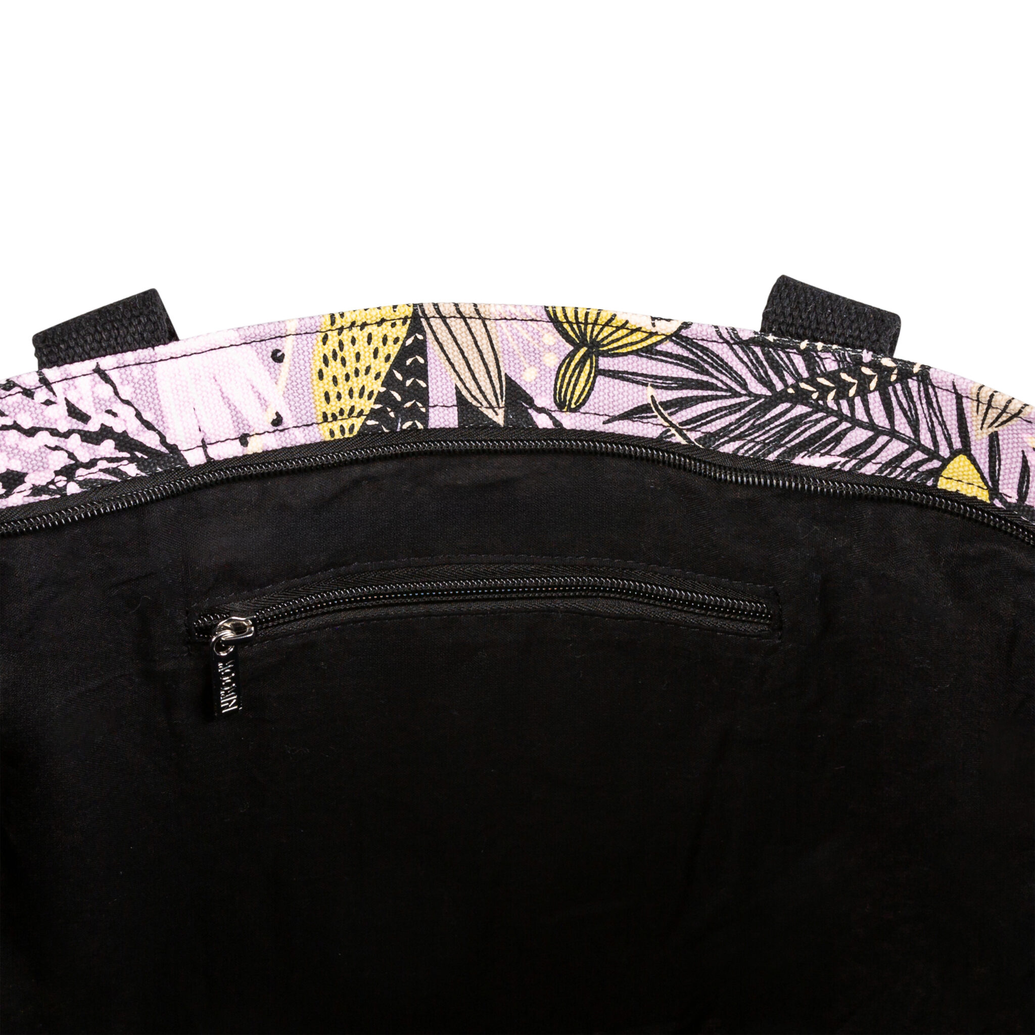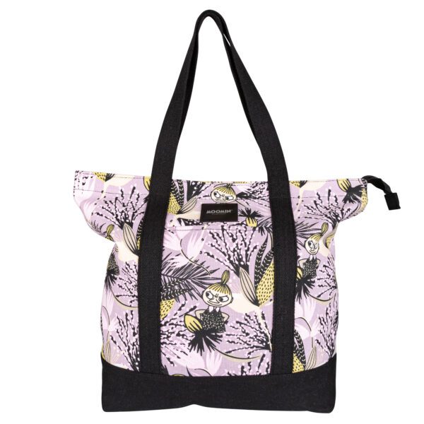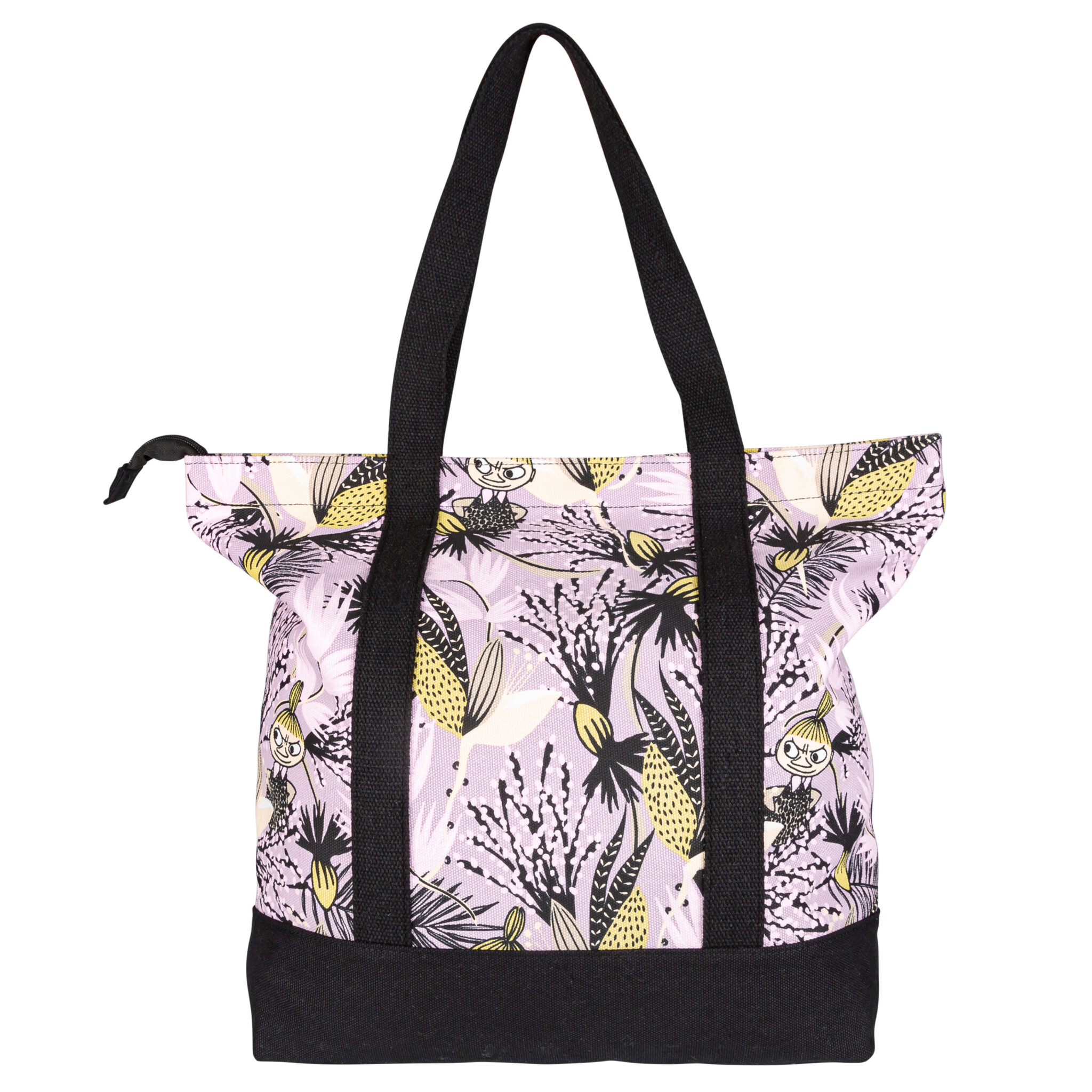 Snygg, stadig och praktisk Mumin väska i rosa/lila i bomullscanvas, svart handtag som går att bära både i handen eller över axeln. På väskan syns Linna My i ett hav av blommor. Mått: 40 x 35 x 13 cm.