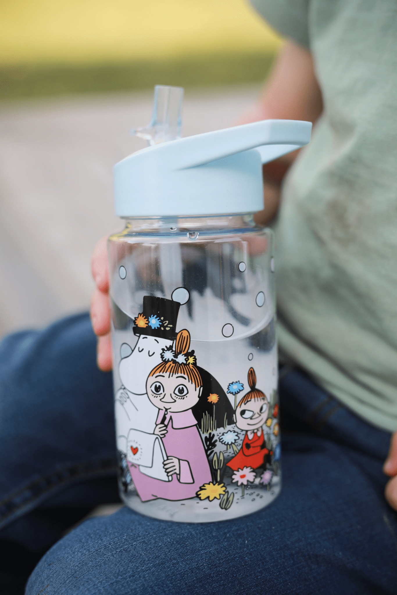 Praktisk vattenflaska med sugrör och pip. Fint motiv där vännerna i mumindalen ses mysa på en picknick, ljusblått lock. Rymmer 550 ml. Perfekt flaska att ha på jobbet, på träningen, i skolväskan och på utflykten. Handdiskas.