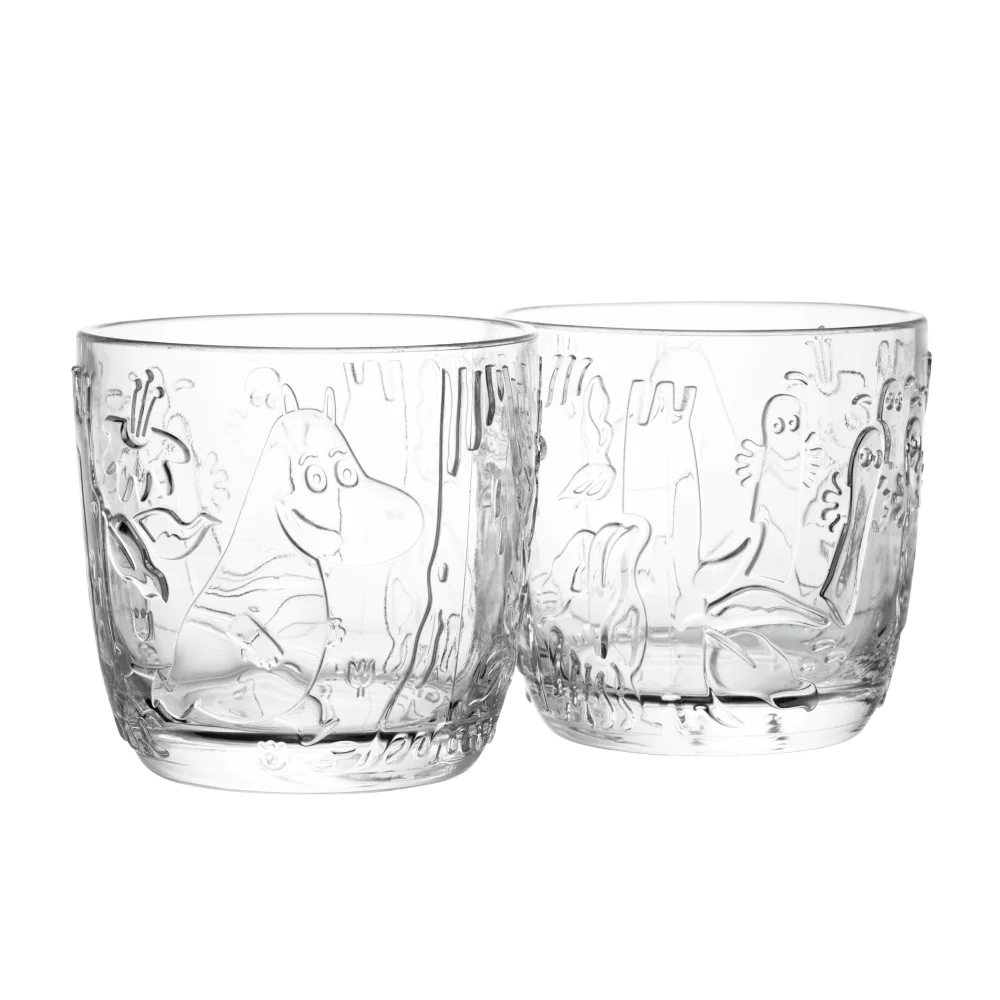 Utforska den fantastiska Moomin Arabia kollektionen med präglade glas inspirerad av Tove Janssons roman “ Trollkarlens hatt ”.