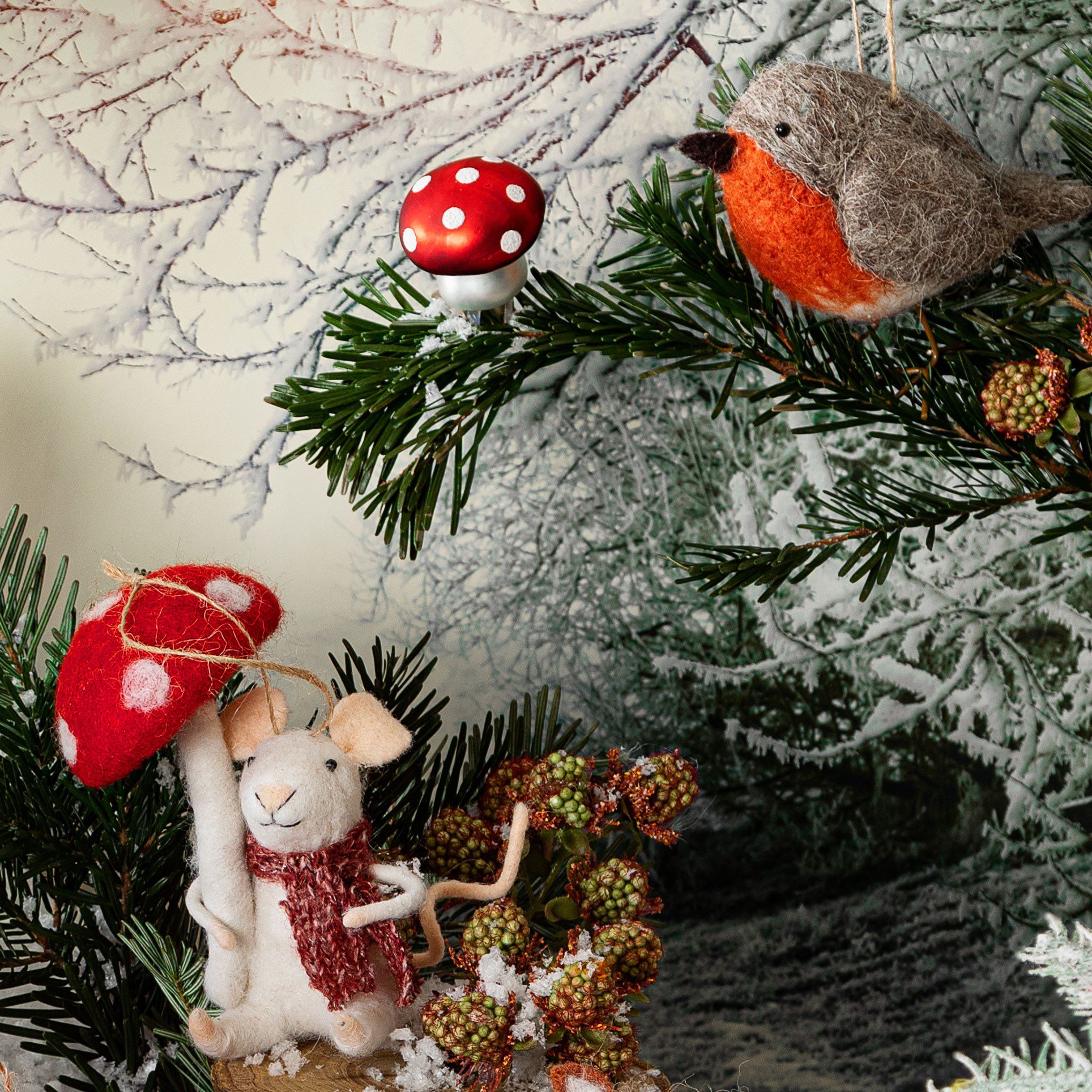 Musen och svampen är handgjorda i filt, för att inte frysa har den lilla musen på sig en stickad halsdauk.