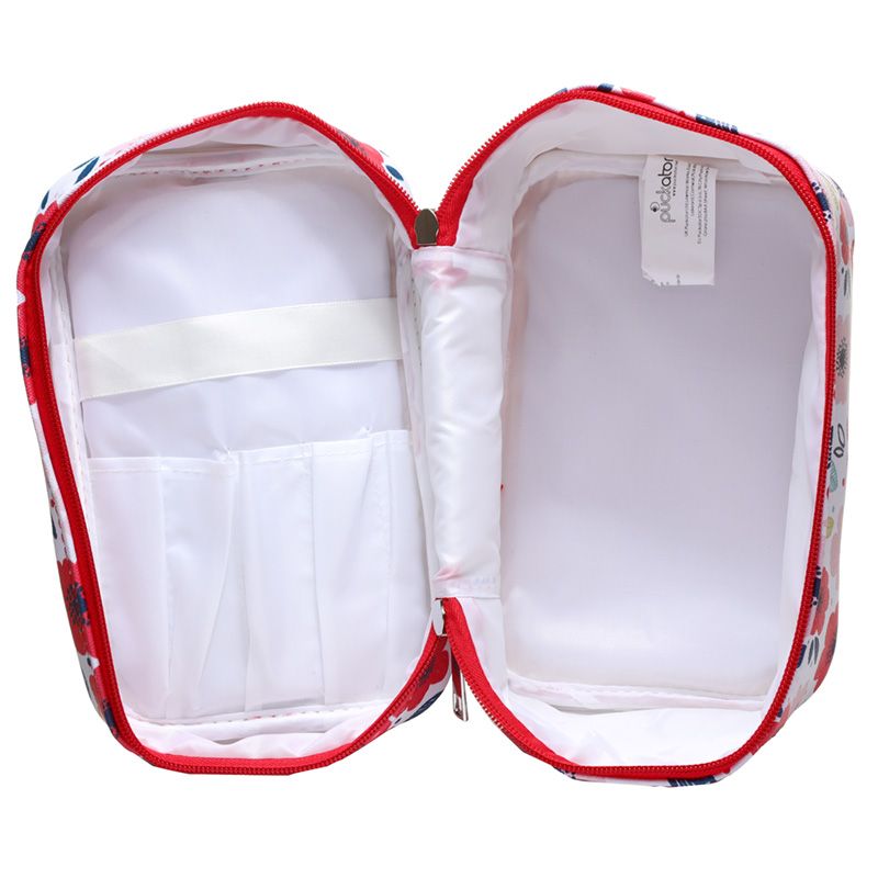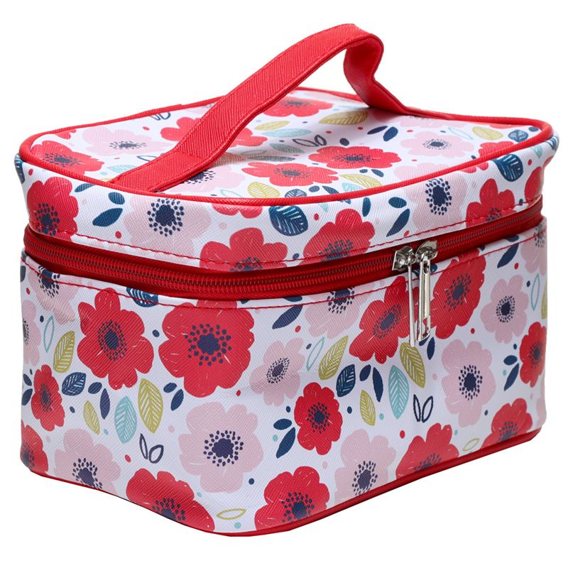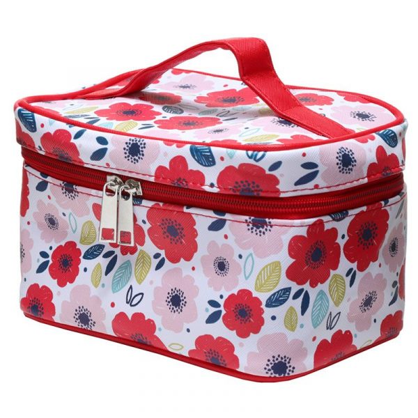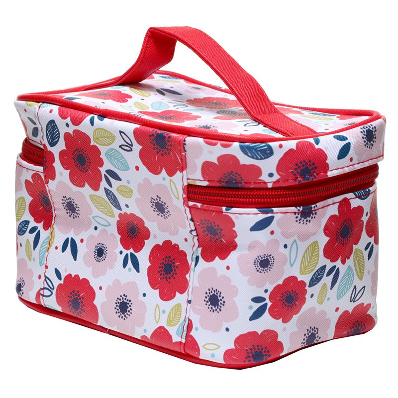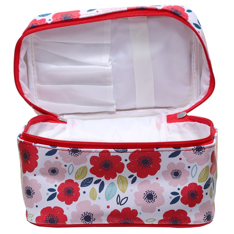 Praktisk necessär med dragkedja och handtag och fint motiv med röda vallmoblommor. Utsida med vit botten och röd/rosa mönster med blå och gröna inslag, vit insida med flera fack i locket, som hjälper dig att hålla reda på småsaker.