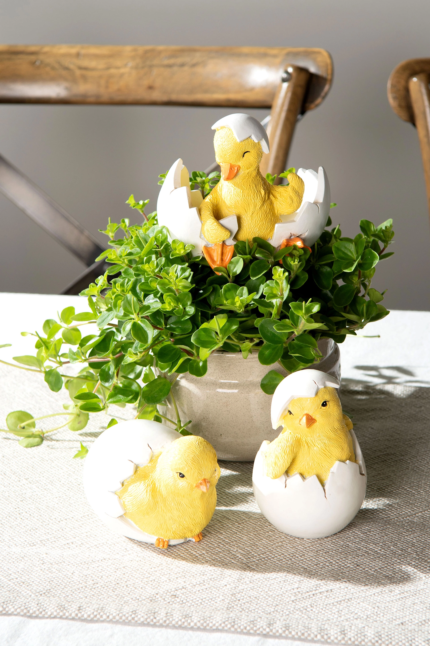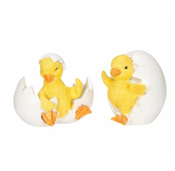 Skapa påskglädje hemma med dessa söta nykläckta kycklingar som tittar ut ur sina ägg. Dekorationerna är tillverkade av poly och är ca 10 cm höga. Perfekta att ställa fram i köket, vardagsrummet eller uterummet. Ett charmigt par som sprider värme och vårkänsla i hemmet.