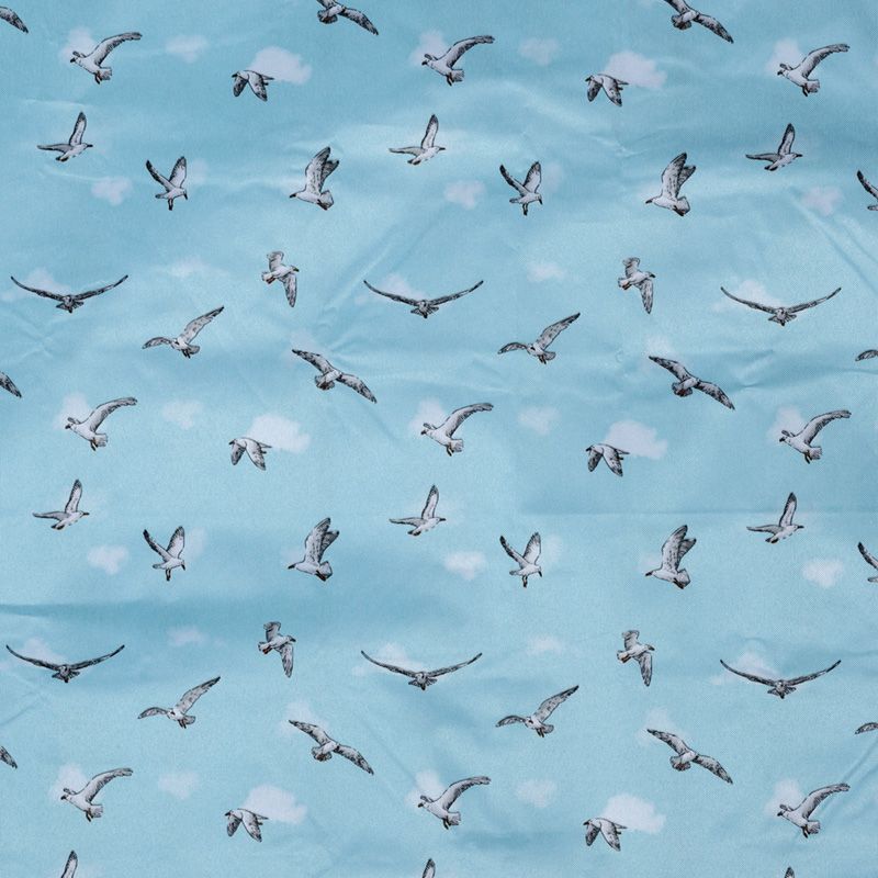 Mått ca 158 x 140 cm. Somrigt motiv med fiskmåsar mot blå bakgrund, plastad baksida.