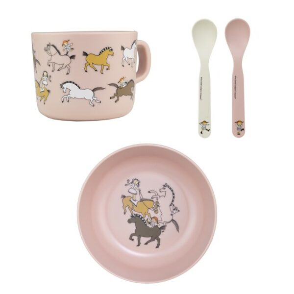 Motiv med Pippi och Herr Nilsson som är på cirkus tillsammans med cirkushästar och cirkusprinsessor. Perfekt set när det är dags för barnet att börja med smakportioner, eller äta själv.