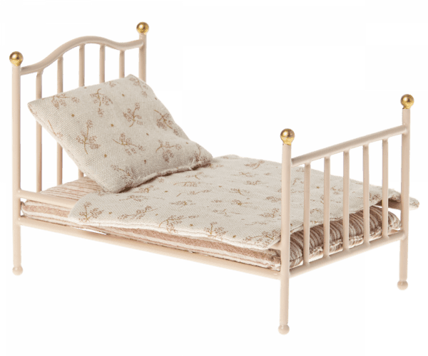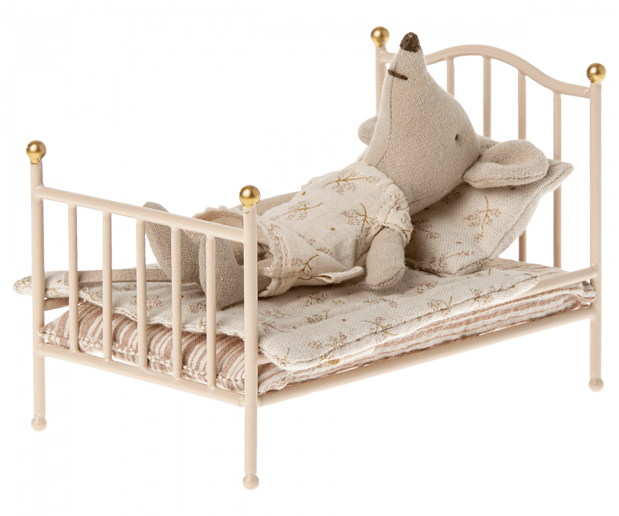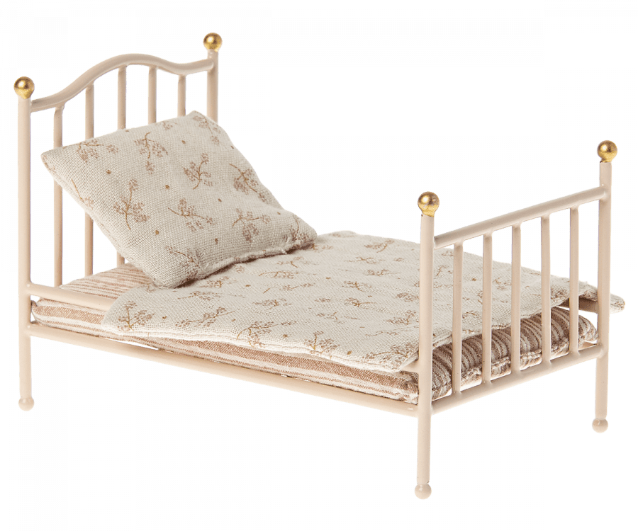 Superfin säng i vintagestil från Maileg, Kudde, täcke och madrass i fint mönster ingår. Storlek höjd 9 cm, bredd 8cm. Passar Mailegs möss. Mössen köps separat.