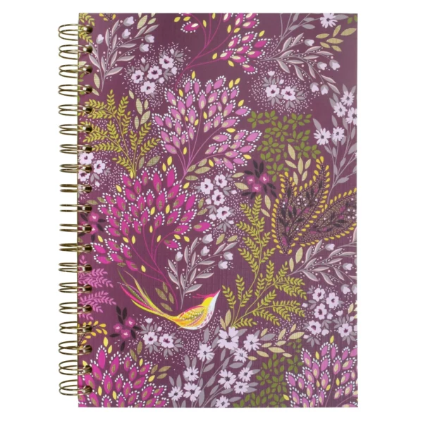 Fint spiralblock med linjerade sidor från Sara Miller London. Plommonfärgat block med guldfärgade detaljer och motiv med fågel och blad. Det är roligare med anteckningar i fina anteckningsböcker!