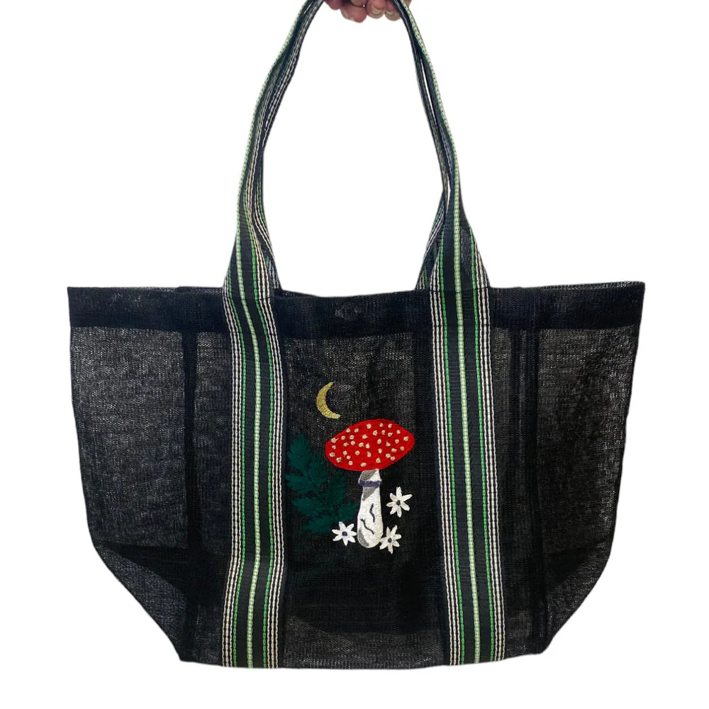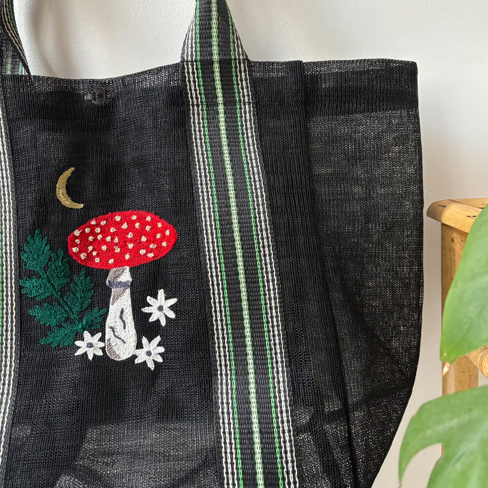 Praktisk shoppingkasse i återvunnet material. Snygg shoppingkasse med mönster med svamp, blommor, en skimrande måne och gröna detaljer. Storlek. 58.5cm x 51cm x 17cm. Passar lika bra på stranden som på shoppingturen.